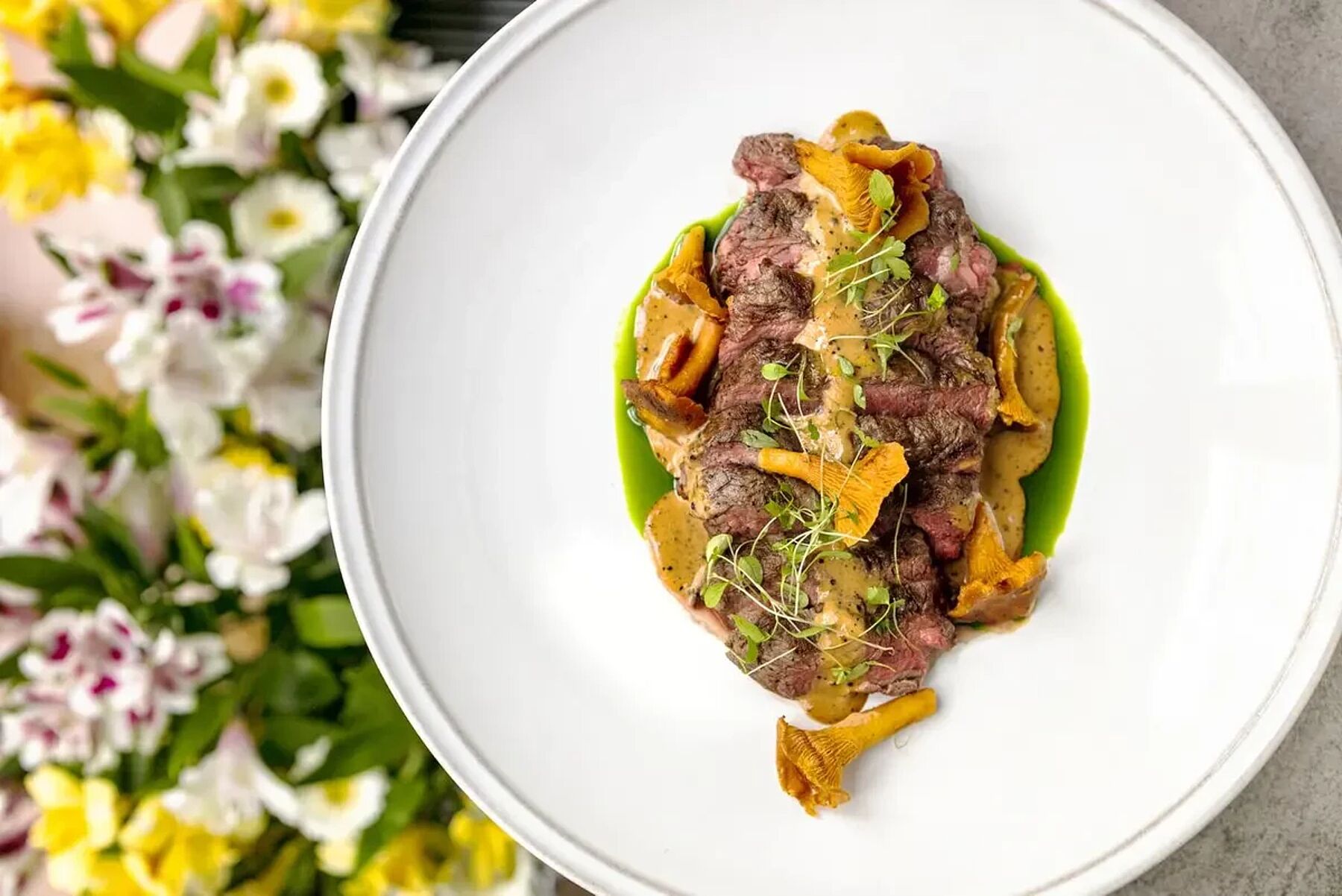 Стейк обжарьте пару минут на оливковом масле. Затем выложите на сковороду лисички и обжарьте их вместе с мясом до его готовности. Накройте сковороду крышкой, снимите с огня и дайте настояться 3 минуты, чтобы мясо напиталось ароматом грибов.