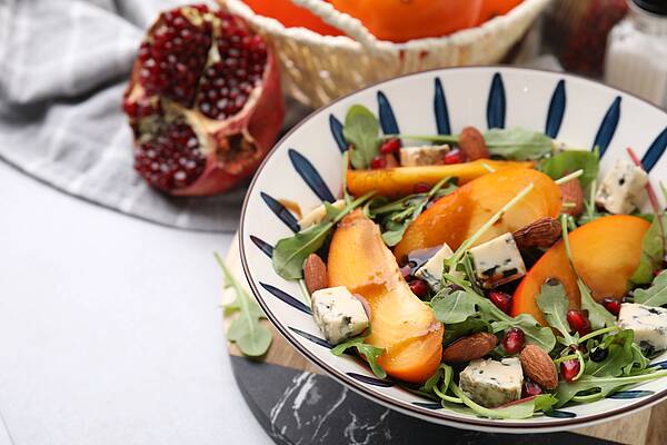 На плоскую тарелку выложить руколу. Хурму нарезать ломтиками и выложить ее на зелень. Наколоть или нарвать руками сыр на небольшие кусочки и выложить равномерно поверх хурмы. В миску влить оливковое масло, сбрызнуть соком лимона, добавить горчицу, молотый перец, тщательно перемешать и заправить салат получившимся соусом.