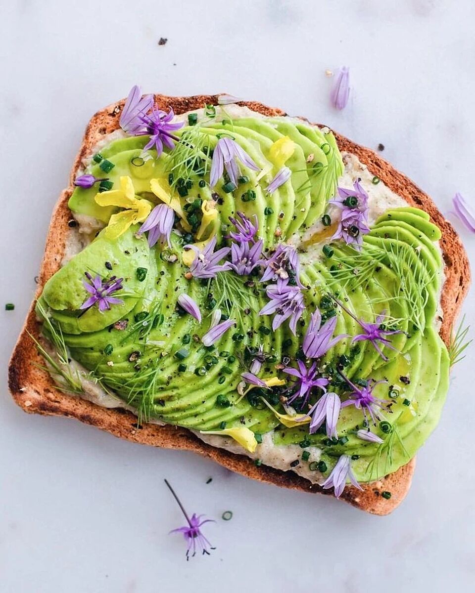 Поджарить тост. На слой соуса из французского лука (продается готовым) или хумуса кладем тонко нарезанный авокадо, украшаем укропом, зеленым луком, цветами капусты, сверху несколько капель оливкового масла.