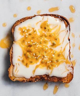 Поджарить хлеб, смазать кокосовым маслом, выложить сверху мякоть маракуйи, полить сиропом агавы и посыпать семенами кунжута.