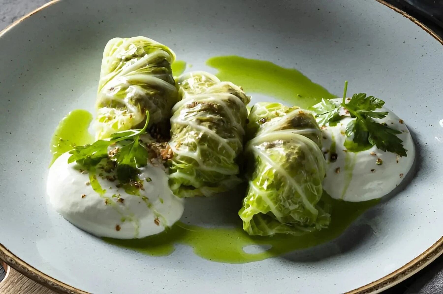 Приготовить начинку. Полбу хорошо промыть, залить чистой водой и оставить на 2 часа. Слить воду из крупы, снова залить полбу водой в пропорции одна часть крупы на три части воды. Довести до кипения и варить на небольшом огне примерно 35 минут. Крупа не должна слишком сильно размякнуть. За несколько минут до конца варки полбу посолить. Белые грибы замочить на 1 час. Затем воду слить, залить грибы чистой водой, довести до кипения и варить на небольшом огне 15 минут. Топинамбур хорошо вымыть щеткой. Кожуру не очищать — в ней весь вкус. Нарезать топинамбур мелкими кубиками величиной с полбяное зерно. Бланшировать топинамбур 7–10 мин в кипящей воде, как только он станет чуть мягче, откинуть на сито. Такими же кубиками нарезать 200 г лука. Грибы нарезать чуть крупнее, чем топинамбур. Разогреть в сковороде 2 столовых ложки растительного масла, выложить лук и жарить, помешивая, пока он не станет мягким, прозрачным, соломенного оттенка, 7–10 минут. Добавить грибы и жарить их вместе с луком, помешивая, еще 2 минуты. Снять лук с грибами со сковороды и переложить в миску. Полбу откинуть на дуршлаг, дать стечь воде, затем выложить к грибам и луку. Добавить в начинку топинамбур, хорошо перемешать, попробовать и добавить соль и свежемолотый перец по вкусу. Начинку остудить. Подготовить капусту. С кочана снять верхние самые грубые листья, вырезать кочерыжку. Выложить кочан целиком в большую кастрюлю (такую, чтобы кочану не было тесно) с кипящей водой и варить 5–7 минут. Достать кочан из кастрюли, дать ему немного остыть и отделить верхние листья. Кочан отложить — потом из него можно сварить, например, щи. Срезать у основания листьев толстые грубые прожилки, стараясь не создавать дырок. Затем отбить каждый лист до равномерной толщины. Выложить в центр каждого листа примерно 70–75 грамм начинки, свернуть голубцы, подогнув края листьев. Готовить голубцы в пароварке, подложив под них лист капусты, чтобы они не прилипали, в течение 7 минут.