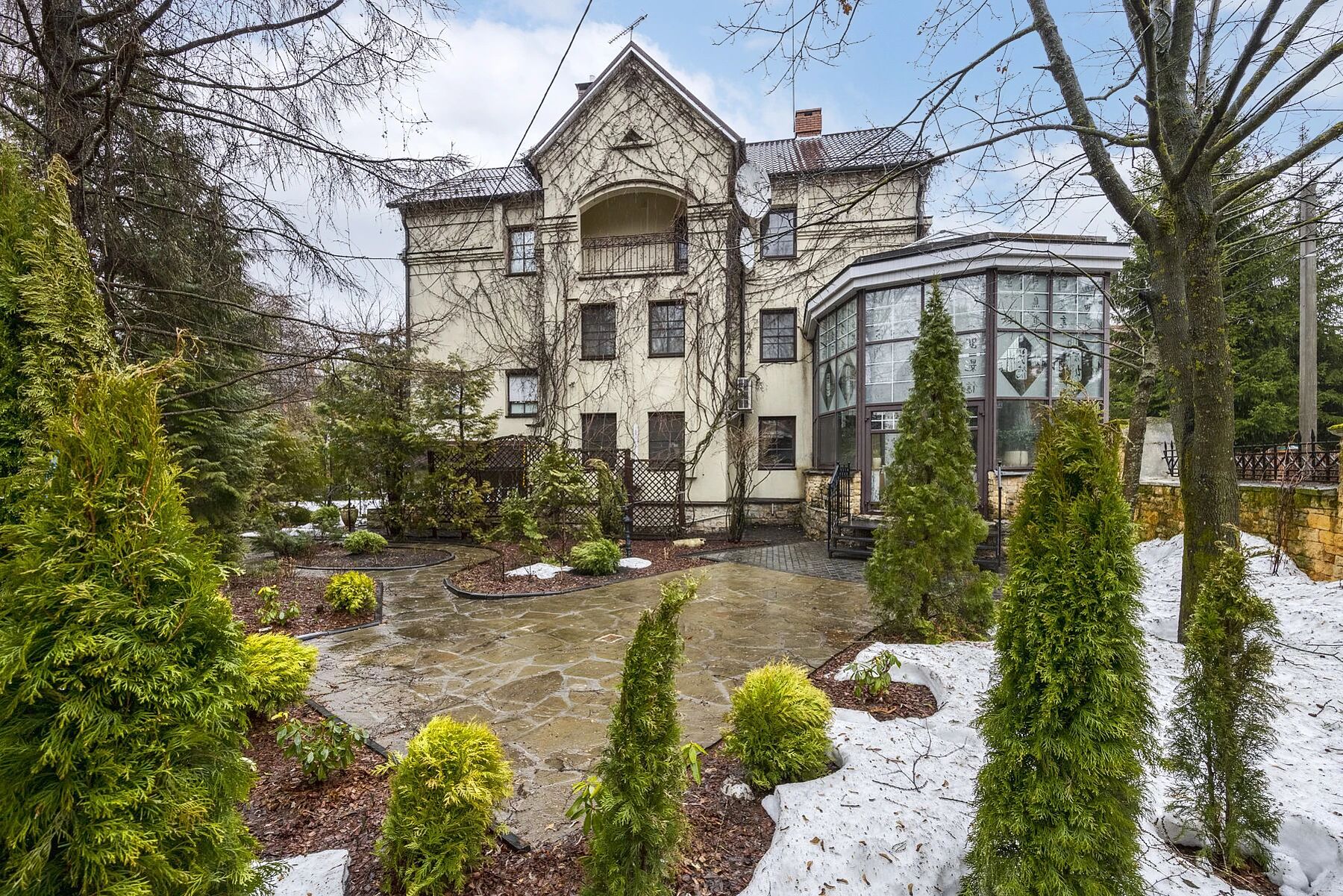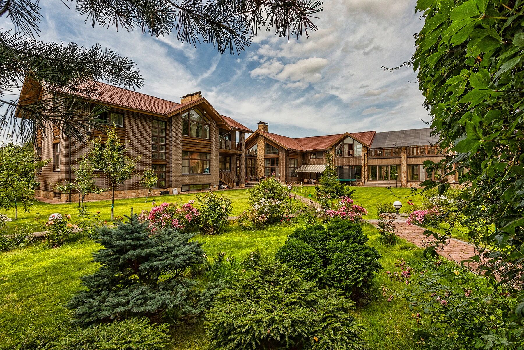 На участке площадью 55 соток располагаются несколько домов, соединенных между собой галереей-зимним садом. В отдельном крыле — спа-зона с большим бассейном и выходом на террасу, а также русская баня.