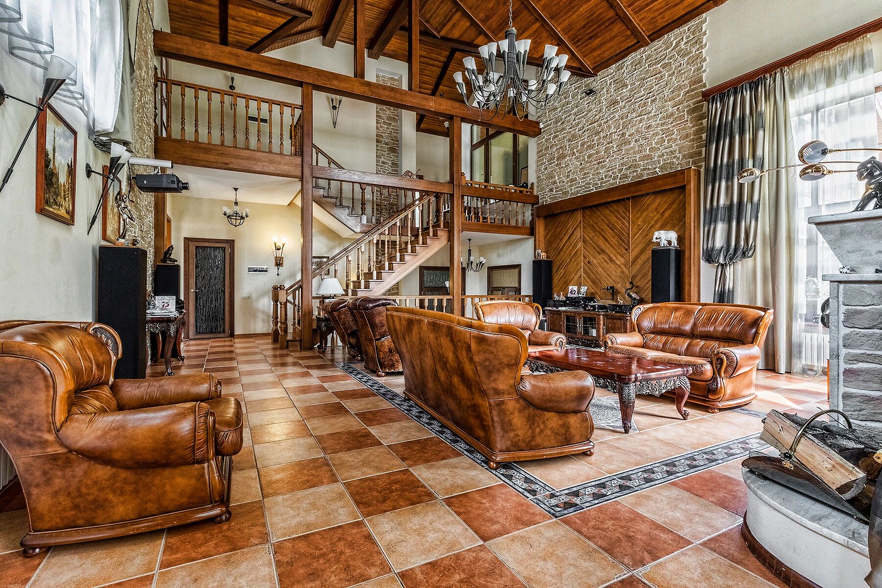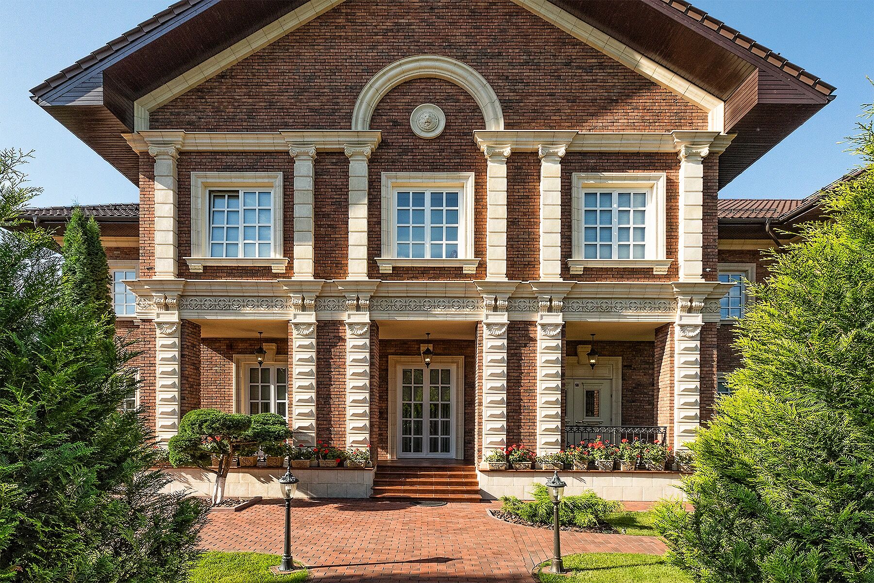 Если пока не представляете, какой площади дом вам нужен, предлагаем начать с чего-то масштабного. Например, двухэтажной усадьбы площадью 2000 м². 6 спален и 8 ванных, сауна и бассейн, спортзал, просторный двухсветный зал с камином, терраса для отдыха на открытом воздухе, гараж на 4 авто — после такого размаха вы вряд ли согласитесь на меньшее.