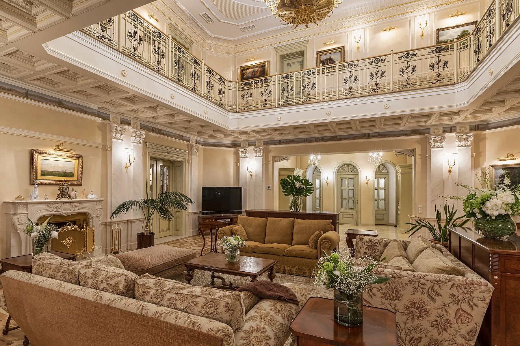 Трехэтажный особняк в классическом стиле общей площадью 1000 м² находится в коттеджном поселке «Потапово». На первом уровне — гостиная с выходом на террасу, кухня-столовая, санузел, зимний сад и гардеробная. На втором — лаундж-зона, три спальни, санузел и кабинет, на третьем — уединенная мастер-спальня.
