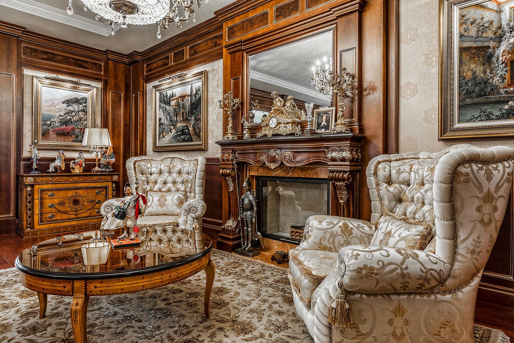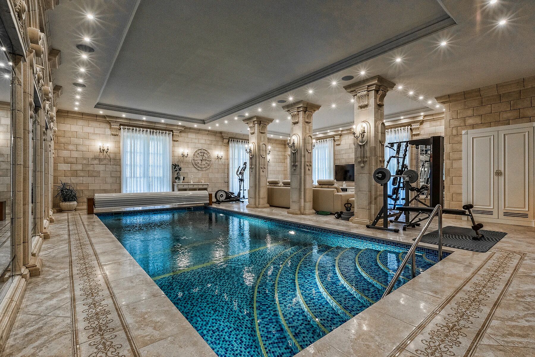 На цокольном этаже — фитнес зал и спа-зона с бассейном и сауной, домашний кинотеатр, бильярдная, бар, винный погреб. Здесь точно не получится заскучать. На первом этаже — каминный зал, кабинет, приемная, мастер-спальня с ванной и гардеробной, комната отдыха, кухня, столовая, гардеробная и холл, а на втором этаже — 3 гостевые спальни, детская, игровая, кабинет и комната для персонала.