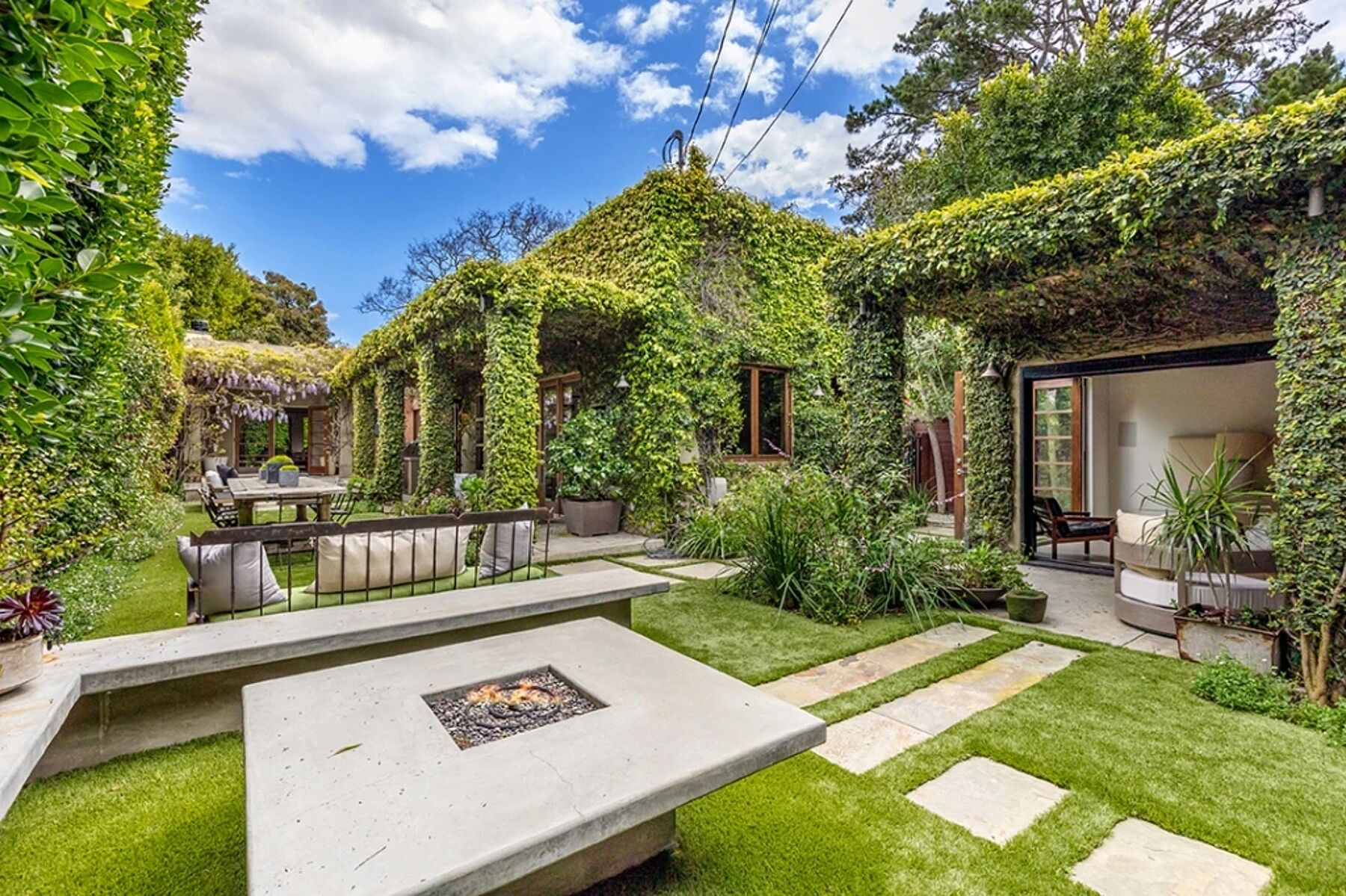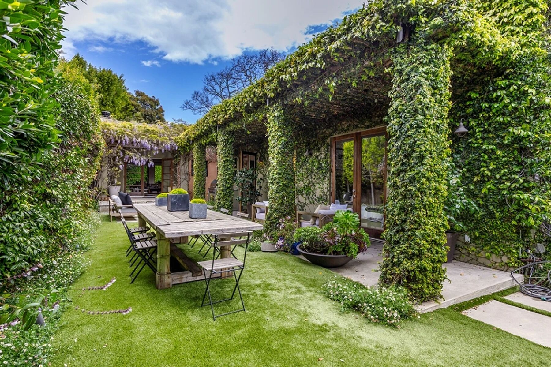 Задний фасад практически полностью увит виноградными лозами и глицинией. Вечнозеленая искусственная трава, густая живая изгородь и другие насаждения создают пышный и уединенный оазис со встроенным барбекю, местом для костра и обеденной зоной на свежем воздухе. Также имеется искусственный водоем во дворе и гидромассажная ванна.
