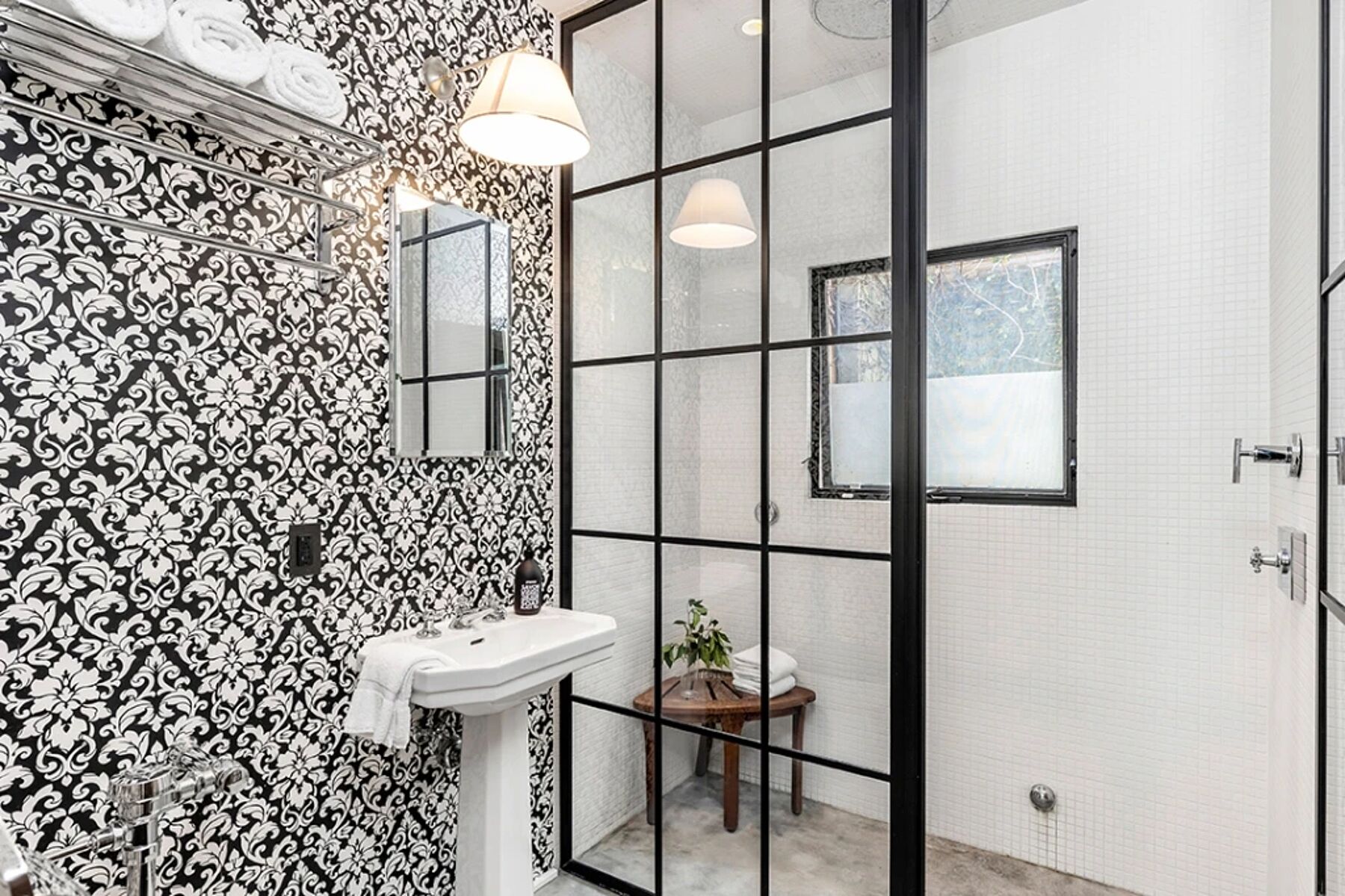 Бунгало площадью почти 150 м² вмещает две спальни и две ванные, а отдельно стоящее помещение — вероятно, когда-то это был гараж — предлагает дополнительное жилое пространство. Французские двери на противоположных стенах гостиной с камином и кухни открытой планировки обеспечивают плавную интеграцию с жилыми помещениями и внутренним двориком, то же самое делает и ряд широких дверей по периметру.