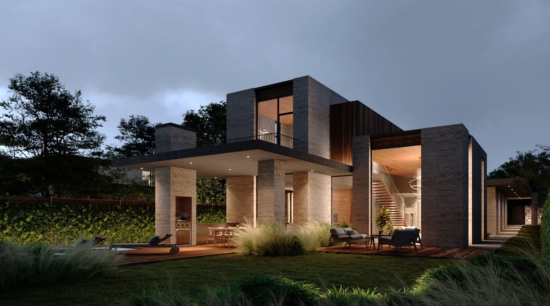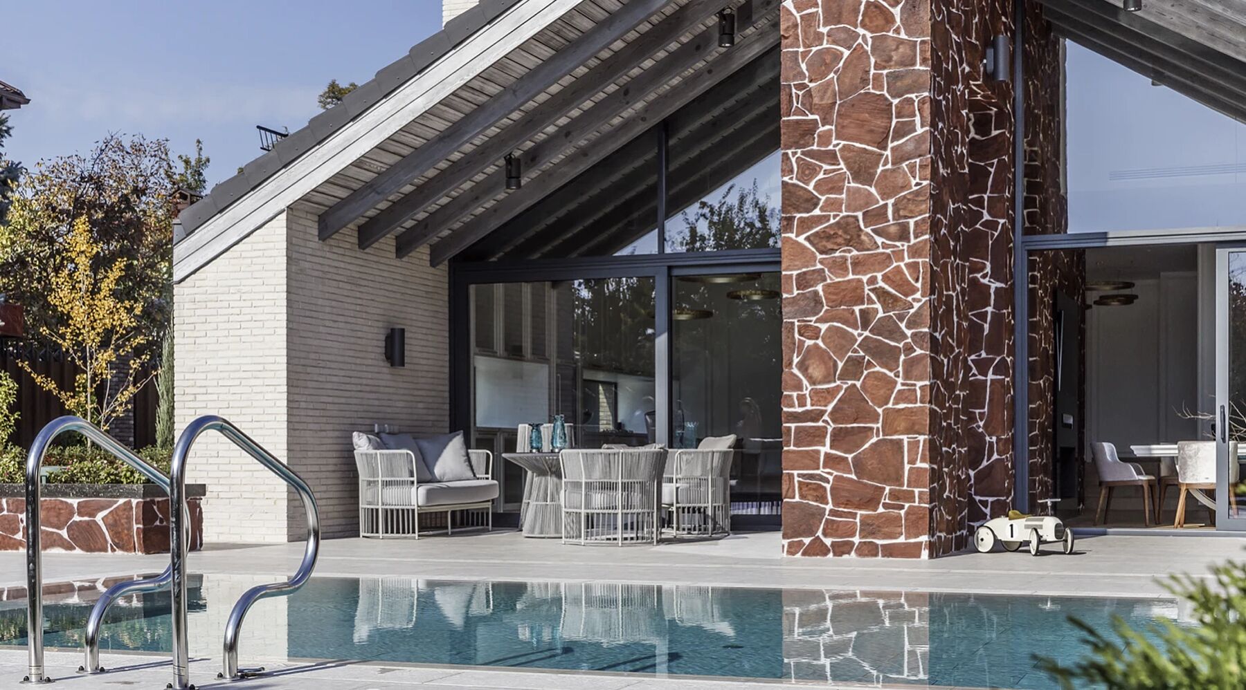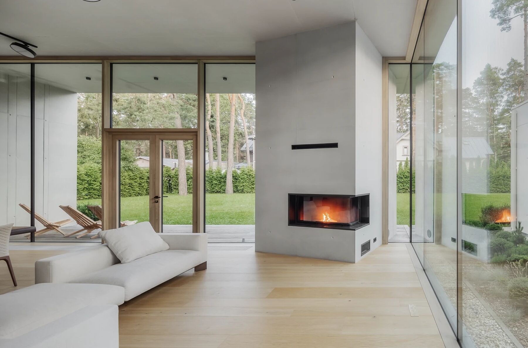 Дом для семьи из четырех человек обыгрывает идею контраста между монументальной «оболочкой» — и прозрачной, наполненной светом и воздухом «изнанкой». Приземистые объемы из железобетона облицованы кирпичом и камнем, а панорамное остекление открывает взгляду интерьер, который становится полноценным элементом архитектуры. Симметрию здания динамично подчеркивает труба двустороннего камина, которая проходит прямо по центру фасада.