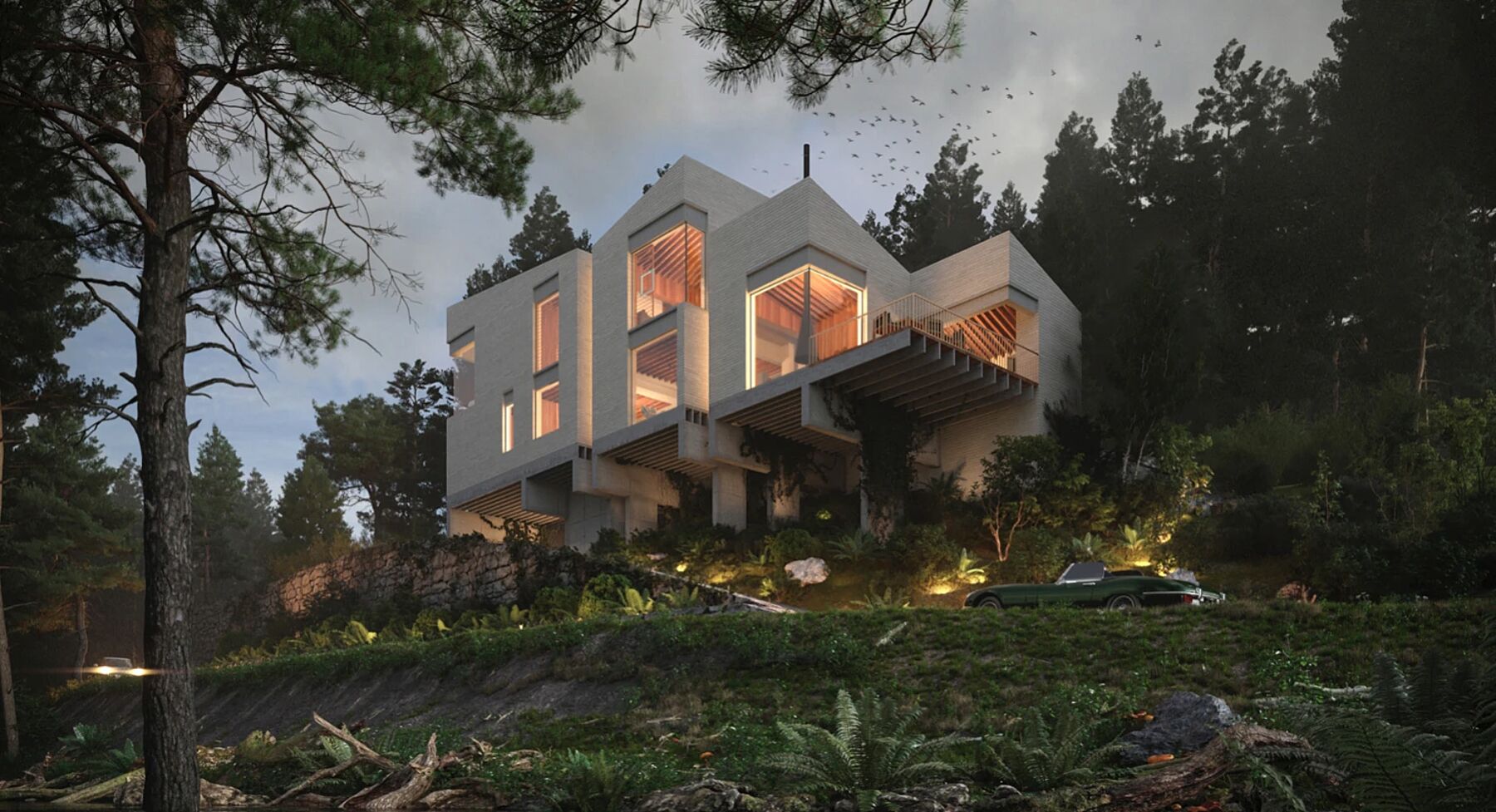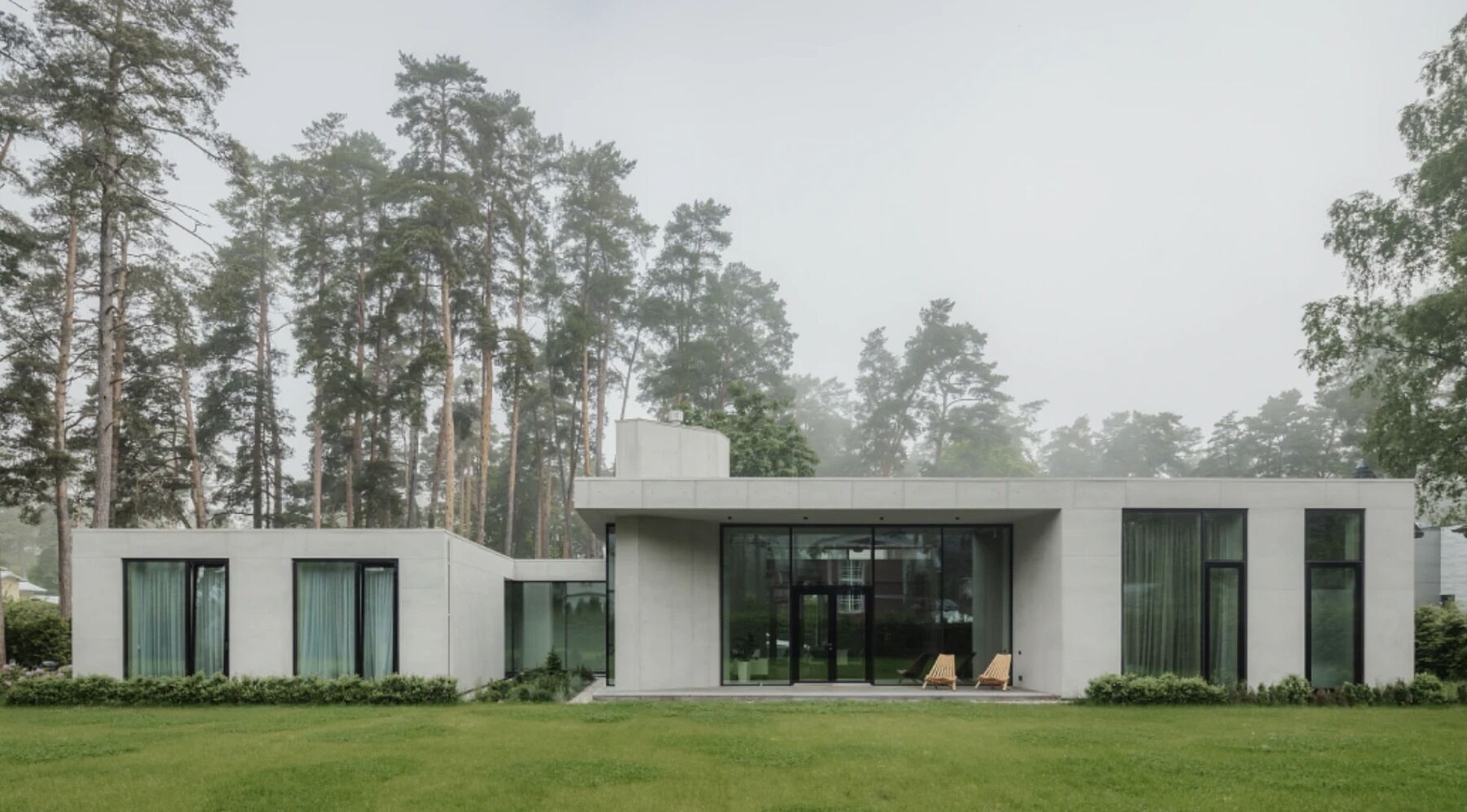 Дом расположился в окружении вековых сосен, его фасад смотрит на юг. Бетонная фактура стен и живописный пейзаж дополняют друг друга и составляют единую композицию. В тело дома врезается внутренний дворик с деревьями, отделяя спальни от общественной зоны.