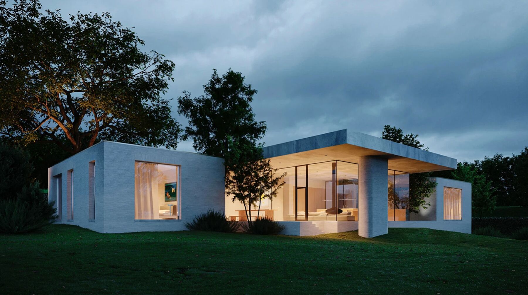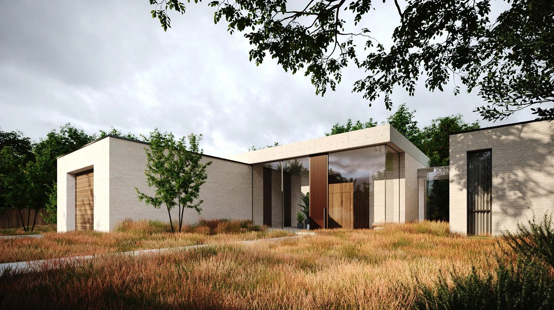 Весь объем дома выполнен в белом кирпиче со швом в тон, благодаря чему он воспринимается как единое целое. Бетон — это второй материал и он появляется только фрагментарно, в покрытии центрального объема. Материалы, используемые в облицовке фасадов, гармонично продолжаются и внутри дома, стирая границы между внешним и внутренним.