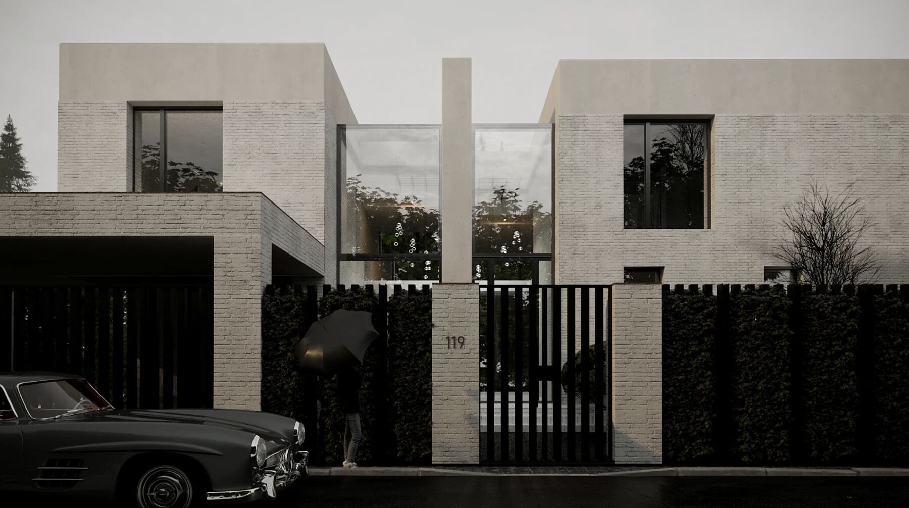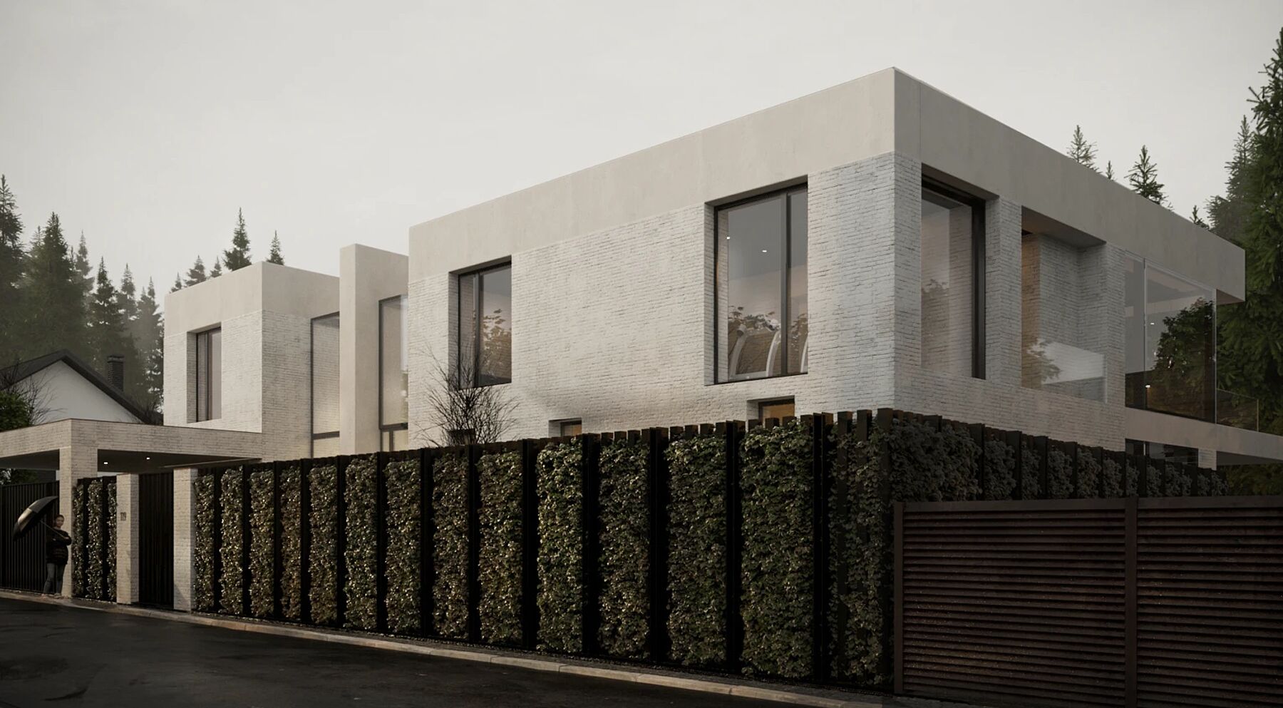 Планировка дома продиктована очертаниями участка. Светлая цветовая гамма и большие витражи придают визуальную легкость, уравновешивая монументальные геометрические объемы. Стены выполнены из белого кирпича, разделенного полосами пигментированного светлого бетона.