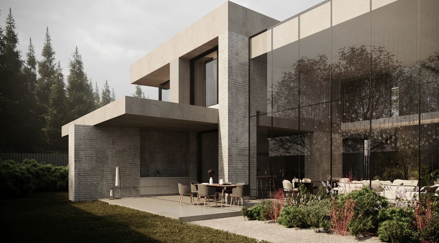 Акцентный элемент дома — прозрачный стеклянный объем, разделенный кирпичным пилоном. В него встроены входная группа и лестница на второй этаж. Тыльный фасад почти полностью остеклен. В этой части находится главное пространство дома — двухсветная гостиная, функционально связанная с кухней-столовой, из которой осуществляется выход на террасу и сад. Вокруг центрального пространства сгруппированы кабинет, спа-зона и вспомогательные помещения, на втором этаже расположены спальни членов семьи.