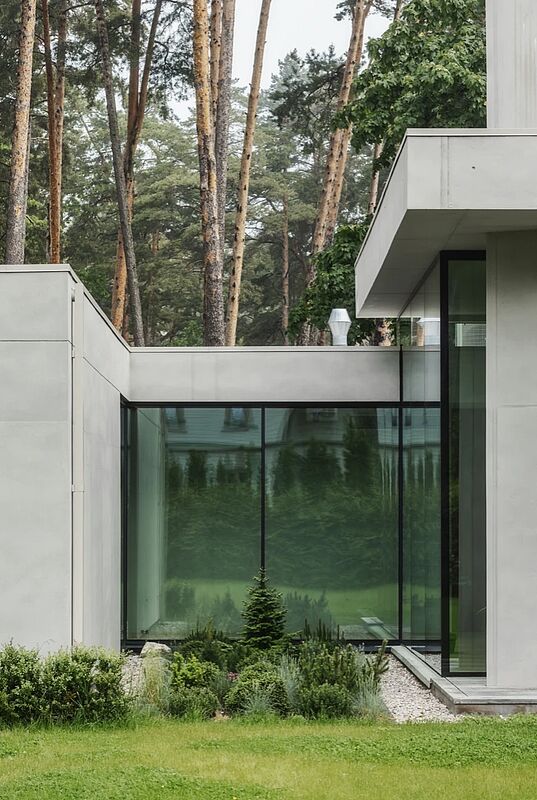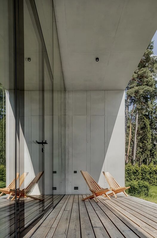 Дом расположился в окружении вековых сосен, его фасад смотрит на юг. Бетонная фактура стен и живописный пейзаж дополняют друг друга и составляют единую композицию. В тело дома врезается внутренний дворик с деревьями, отделяя спальни от общественной зоны.