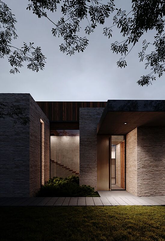 Дом для семьи из четырех человек обыгрывает идею контраста между монументальной «оболочкой» — и прозрачной, наполненной светом и воздухом «изнанкой». Приземистые объемы из железобетона облицованы кирпичом и камнем, а панорамное остекление открывает взгляду интерьер, который становится полноценным элементом архитектуры. Симметрию здания динамично подчеркивает труба двустороннего камина, которая проходит прямо по центру фасада.