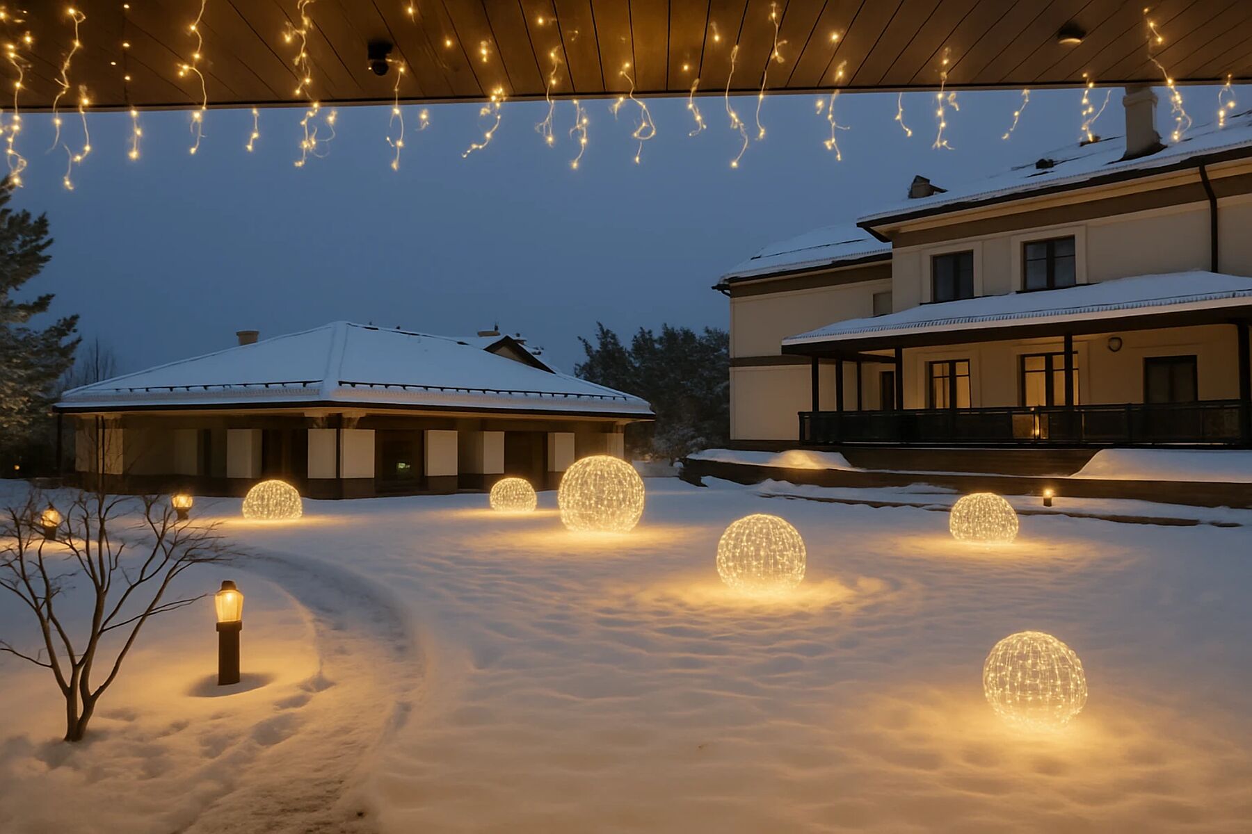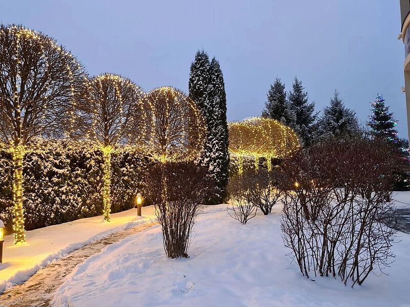 Когда мягкая подсветка фасада подчеркивает его архитектурные линии, деревья переливаются тысячами огней, а у входа встречают изящные световые фигуры — именно в такие моменты создается неповторимое новогоднее настроение и остается в памяти надолго.