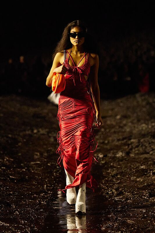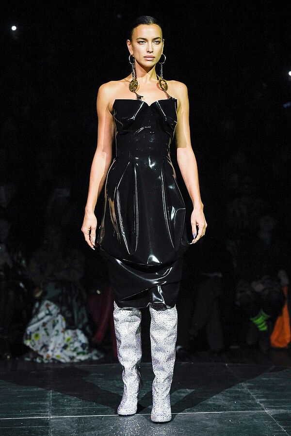 Показ новой весенне-летней коллекции Vivienne Westwood открыла Ирина Шейк. Модель вышла на подиум в черном латексном платье с драпировкой, которое дополнили высокие блестящие сапоги и крупные серьги-кисточки. Партнер Вивьен Вествуд по бренду и по совместительству ее супруг Андреас Кронталер при создании коллекции вдохновлялся эстетикой Ренессанса и 1960-х, объединив их в причудливых образах.