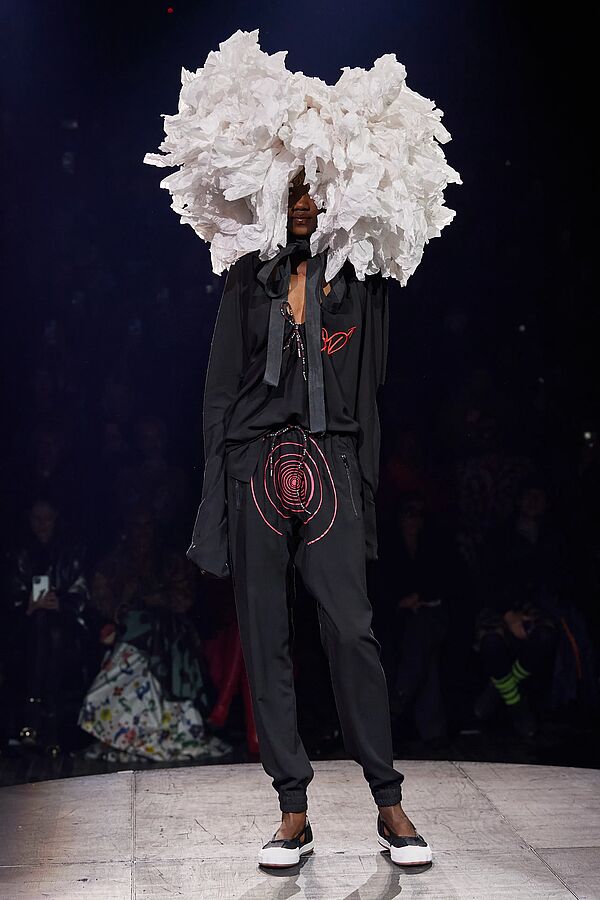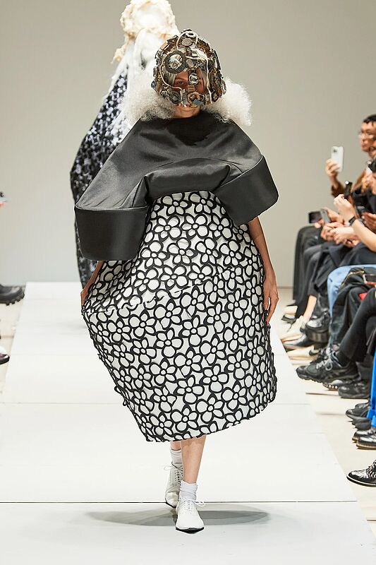 Показ Comme des Garçons — это всегда тонкая грань между модой и искусством. Модели прятались в коконах из нарядов с гипертрофированными пропорциями, цветочными принтами, а их головы украшали клетки. Автором коллекции стала Рей Кавакубо.