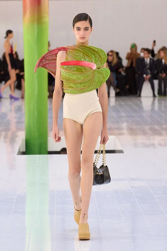 Знаковым элементом показа стали стали лаковые топы с цветочным принтом, будто бы сделанные из фарфора, а также туфли, усыпанные множеством ненадутых шариков. Не удивительно, ведь автор коллекции — Джонатан Андерсон, известный мастерской работой со скульптурными формами.