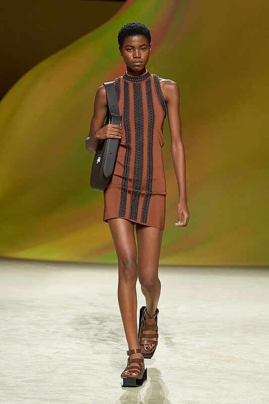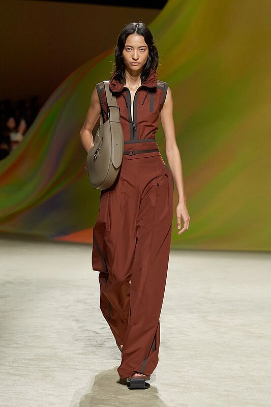 Показ Hermès удивил необычной обувью — босоножками с полыми платформами, бандажными топами, а также новыми кожаными сумками. Вдохновением для коллекции послужили цвета пустыни, а украшением показа стала огромная дюна.