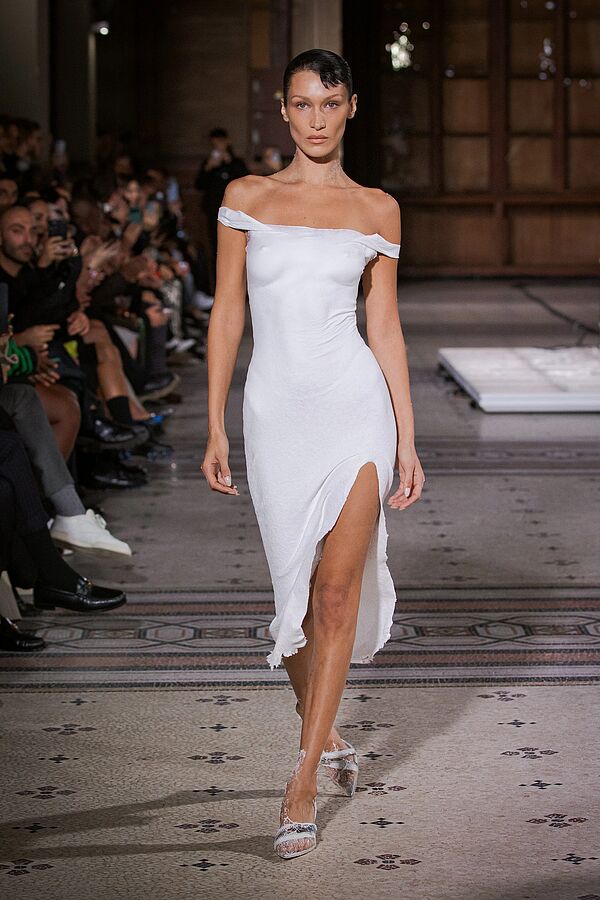 Основатели бренда Coperni Себастьен Мейер и Арно Вайан устроили для зрителей представление, в котором приняла участие Белла Хадид. В финале показа она вышла на сцену вышла полуобнаженной, и несколько человек за пару минут нанесли на ее тело платье при помощи распылителей. Технология принадлежит компании Fabrican: она разработала жидкость из хлопковых и синтетических волокон, которая при контакте с телом превращается в плотный материал.