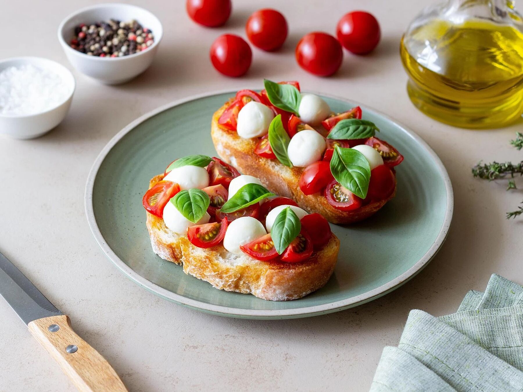 Тонко нарежьте базилик, оставив несколько листьев для украшения. Выложите помидоры, моцареллу, нарезанный базилик и чеснок миску, добавьте 1 столовую ложку оливкового масла и бальзамический уксус, хорошо перемешайте. Приправьте солью и перцем. Разогрейте духовку. Смажьте ломтики багета оставшимся оливковым маслом, разложите на противне в один слой, приправьте солью. Поджаривайте хлеб в духовке, пока он слегка не подрумянится, около 1 минуты, стараясь не поджечь края. Когда хлеб будет готов, выложите томатно-сырную смесь на ломтики непосредственно перед подачей и украсьте листьями базилика.
