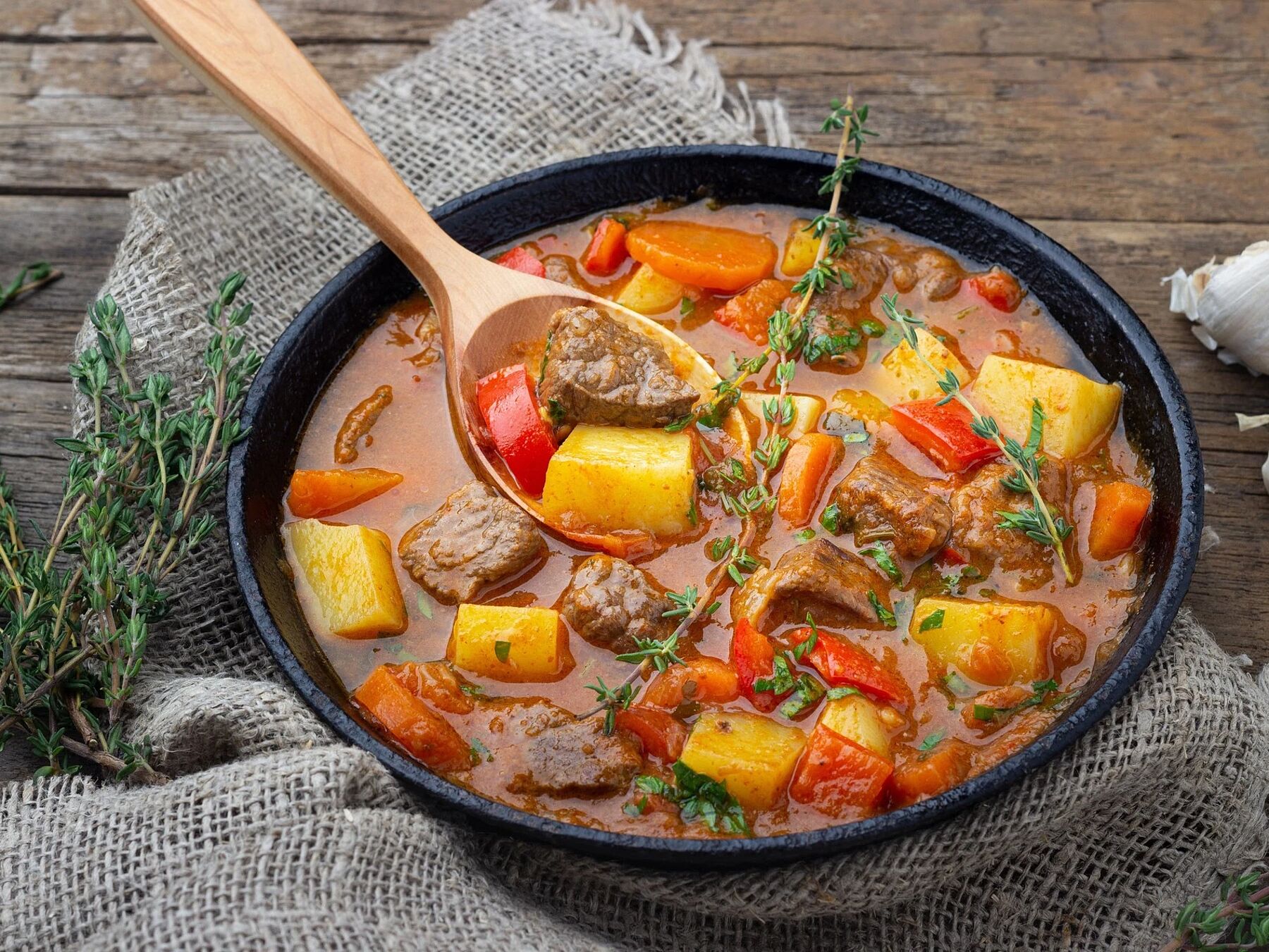 Поджарьте бекон в глубоком сотейнике до хрустящей корочки и переложите его в миску. В оставшемся в сотейнике жире обжарьте говядину, пока она не подрумянится. Уменьшите огонь, добавьте масло, лук и чеснок. Готовьте, помешивая, до золотистого цвета мяса. Добавьте паприку, семена тмина и муку. Тушите, помешивая, еще 2 минуты. Затем добавьте уксус и томатную пасту и готовьте еще с минуту (смесь должна получиться очень густой). Переложите мясную смесь в большую кастрюлю, добавьте бульон, воду, соль, болгарский перец и бекон. Поставьте на большой огонь и доведите до кипения. Затем уменьшите огонь и накройте суп крышкой. Очистите картофель, нарежьте на небольшие кусочки. Добавьте его в суп и варите еще около 30 минут. Когда суп будет готов, приправьте солью и перцем по вкусу.