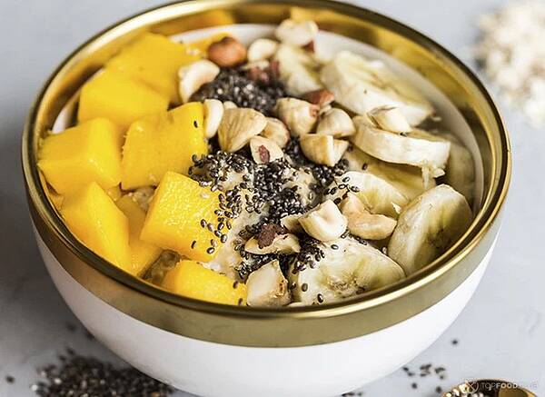 Очистите бананы и манго. Нарежьте их крупными кусочками. Оставьте 1 банан, 1 манго, немного семян чиа и фундука для украшения. Остальное в блендер, добавьте йогурт и измельчите в кашицу. Выложите в миску, украсьте фруктами, орехами и чиа.