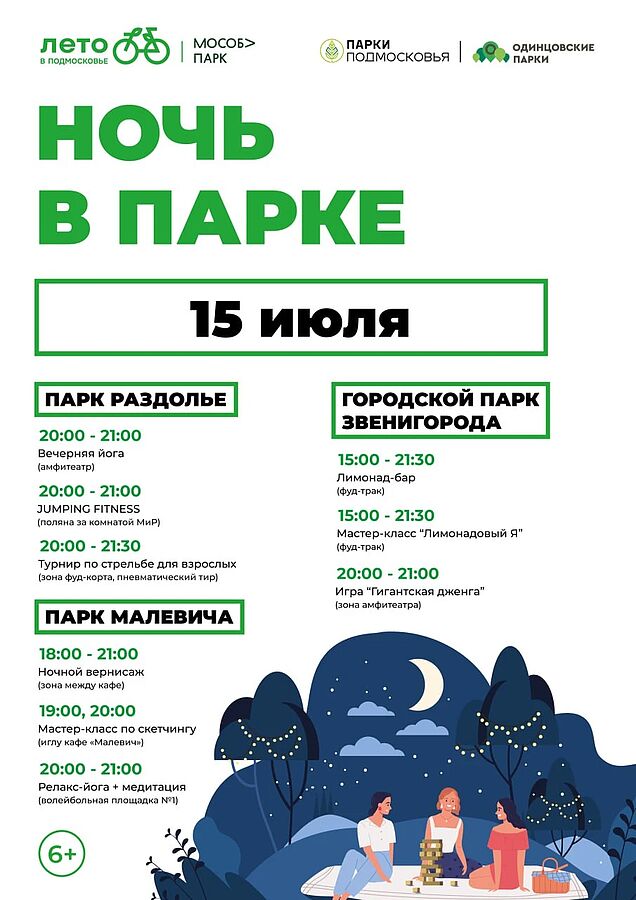 Этнофестиваль пройдет днем, а затем стартует «Ночь в парке». В парке Раздолье в 20:00 запланированы вечерняя йога в амфитеатре (ограничений по возрасту нет) и турнир по стрельбе в пневматическом тире в зоне фудкорта (это развлечение уже только для тех, кто достиг как минимум пятнадцати лет). В парке Малевича с 18:00 до 21:00 пройдет ночной вернисаж выставки члена Союза художников Анжелики Ермак, которая отвлечётся от гостей, чтобы провести мастер-класс по скетчингу в кафе «Малевич». Иной способ снять стресс и расслабиться — релакс-йога и медитация: всех желающих ждут на них в 20:00 на волейбольной площадке напротив кафе «Спортсмены». В Городском парке Звенигорода в рамках «Ночи в парке» с 15:00 до 21:30 каждый час будут проходить мастер-классы с говорящим названием «Лимонадовый Я», а в 20:00 все соберутся в зоне амфитеатра, чтобы сыграть в гигантскую дженгу.