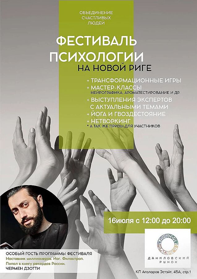 Затем настанет очередь услаждать слух — на концерте живой музыки на веранде рынка. А воскресенье на рынке посвятят шестому чувству — с 12:00 до 20:00 пройдет фестиваль психологии, организованный объединением «Счастливые люди». Мастера разнообразных направлений этой сложной науки, от коуча семейных отношений до энергопрактика и астропсихолога, соберутся, чтобы рассказать обо всех их тонкостях и пополнить ряды своих адептов. Специальный гость — «наставник миллионеров, практикующий йог и мастер гвоздестояния» Чермен Дзотти. Обещаны трансформационные игры, а также мастер-классы по ароматестированию, нейрографике, правополушарному рисованию, работе с метафорическими картами. Бонус — йога. Тех, кто не досидит до конца этого праздника духа, ждут в 19:00 на традиционной «Мафии».