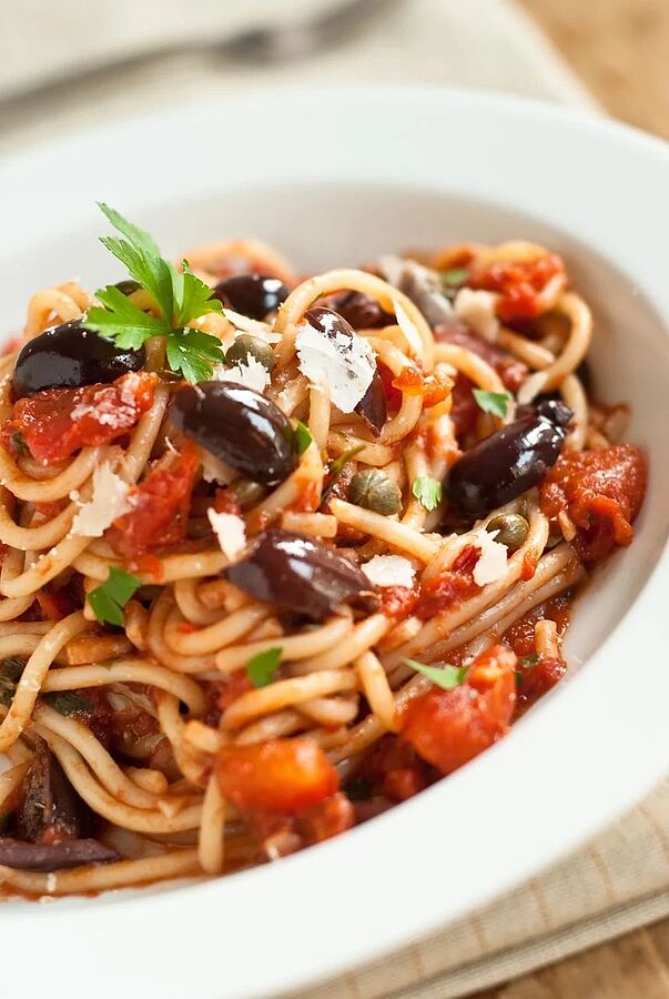 Когда чеснок приготовится, добавьте оливки, каперсы, щепотку чили и томатный соус.