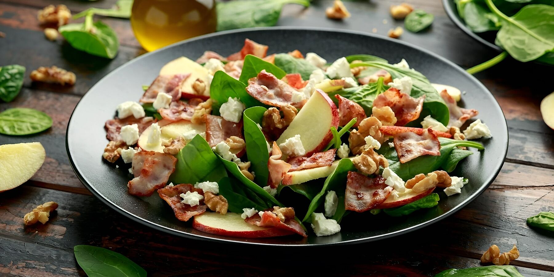 Нагрейте сковороду на сильном огне, добавьте немного оливкового масла. Нарежьте бекон и хлеб кубиками со стороной примерно 1 см. Выложите бекон на сковороду и обжарьте, помешивая, пока бекон немного не поджарится и не выпустит жир. Затем убавьте огонь и добавьте кусочки хлеба. Немного обжарьте до золотистого цвета. Ингредиенты для заправки налейте в чистую баночку от варенья или другую герметичную емкость, закройте крышкой и хорошо встряхните. Попробуйте скорректируйте при необходимости вкус заправки. Выложите зелень на большое блюдо, полейте заправкой. Посыпьте рублеными грецкими орехами и колечками зеленого лука. Сверху выложите большую часть гренок и весь бекон. Хорошо перемешайте. А дальше кончиком ножа откалывайте небольшие кусочки сыра рокфор прямо на салат. Закончив, посыпьте еще раз небольшим количеством орехов и гренок.