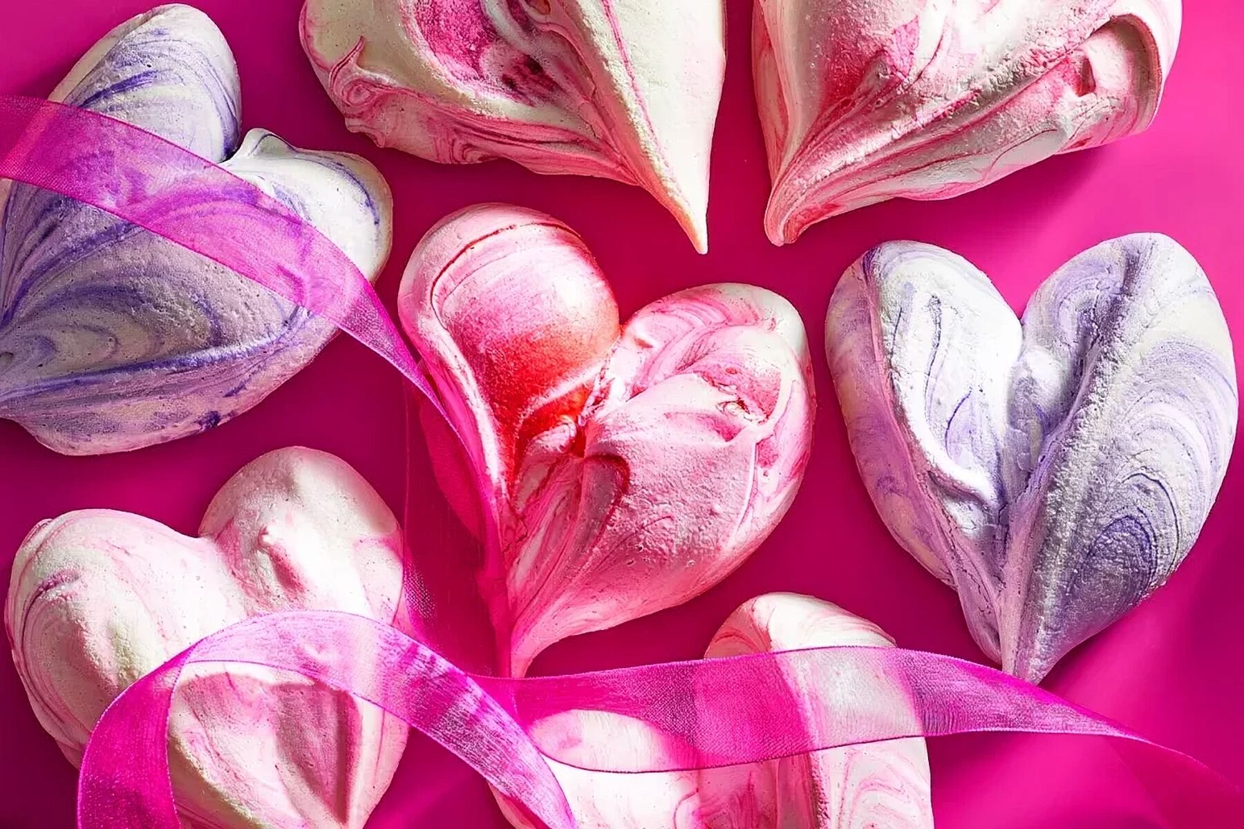 Уложите на противни пергамент. Выкладывайте меренги с помощью столовой ложки в виде сердечка, то есть двумя перекрещивающимися овалами. Формируйте тоже ложкой, смачивая ее в воде. Оставляйте между сердечками расстояние в 4–5 сантиметров. Выпекайте, пока безе не станет сухим и хрустящим (примерно 1,5 часа), пару раз меняйте противни в духовке местами. Когда безе будет готово, выключите духовку и оставьте в ней противни на 30 минут. Затем достаньте безе и остудите на решетках.