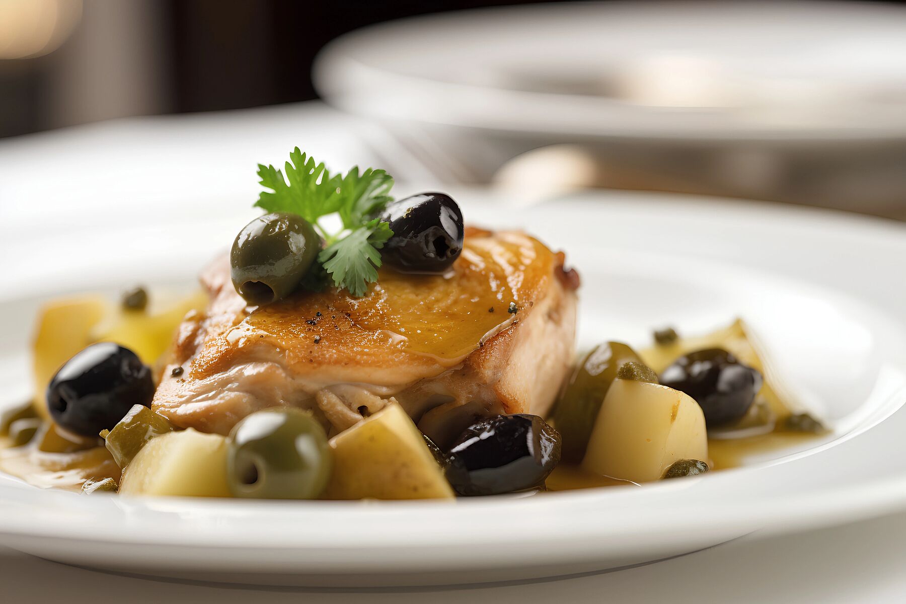 Куриные бедрышки посолите и поперчите с обеих сторон. Надрежьте мясо с внутренней стороны — так куски будут более плоскими и лучше прожарятся. Положите бедрышки на холодную сковороду внешней стороной вниз и поставьте на среднесильный огонь. Прогревайте 2–3 минуты без крышки. Как только начнет выделяться жир, уменьшите огонь до среднеслабого, закройте сковороду крышкой и готовьте 20–25 минут, не переворачивая (это важно). Раздавите, очистите и измельчите чеснок почти до состояния пасты. Слегка раздавите оливки и маслины. Выложите цыпленка на подогретое блюдо кожей вверх. В сковороду, где должен был образоваться слой прижарившегося сока, положите чеснок и обжарьте 30 секунд. Затем влейте уксус и тщательно перемешайте с чесноком и прижарками. Пусть уксус немного выпарится, достаточно 40 секунд. Добавьте в сковороду кетчуп и воду, затем положите оливки и маслины. Прогревайте еще несколько секунд, после чего налейте большую часть соуса вокруг цыпленка, и слегка сбрызните кожу. Цыпленка подавайте сразу же, пока кожа еще хрустящая.