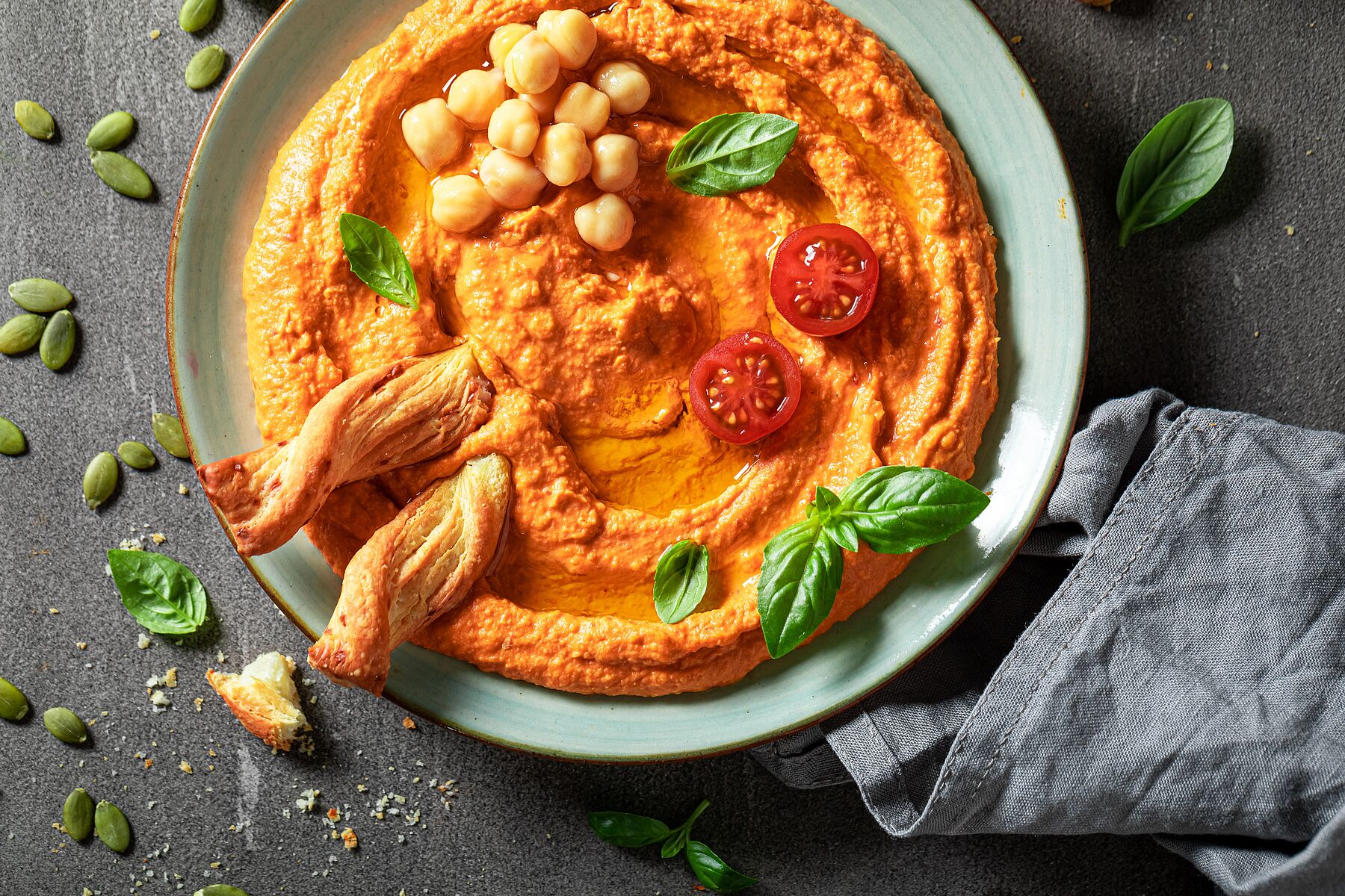 Подавайте хумус с печеной морковью и сыром из кешью. В качестве соуса используйте кедровое молоко.