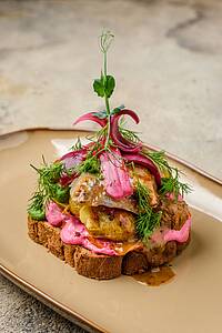 Смажьте хлеб свекольным майонезом и выложите на него ингредиенты в следующем порядке: печеный картофель — свекольный майонез — кружочки моркови — свекольный майонез — сельдь — медово-горчичный соус. Украсьте сверху майонезом, красным луком и микрозеленью, сбрызните зеленым маслом.