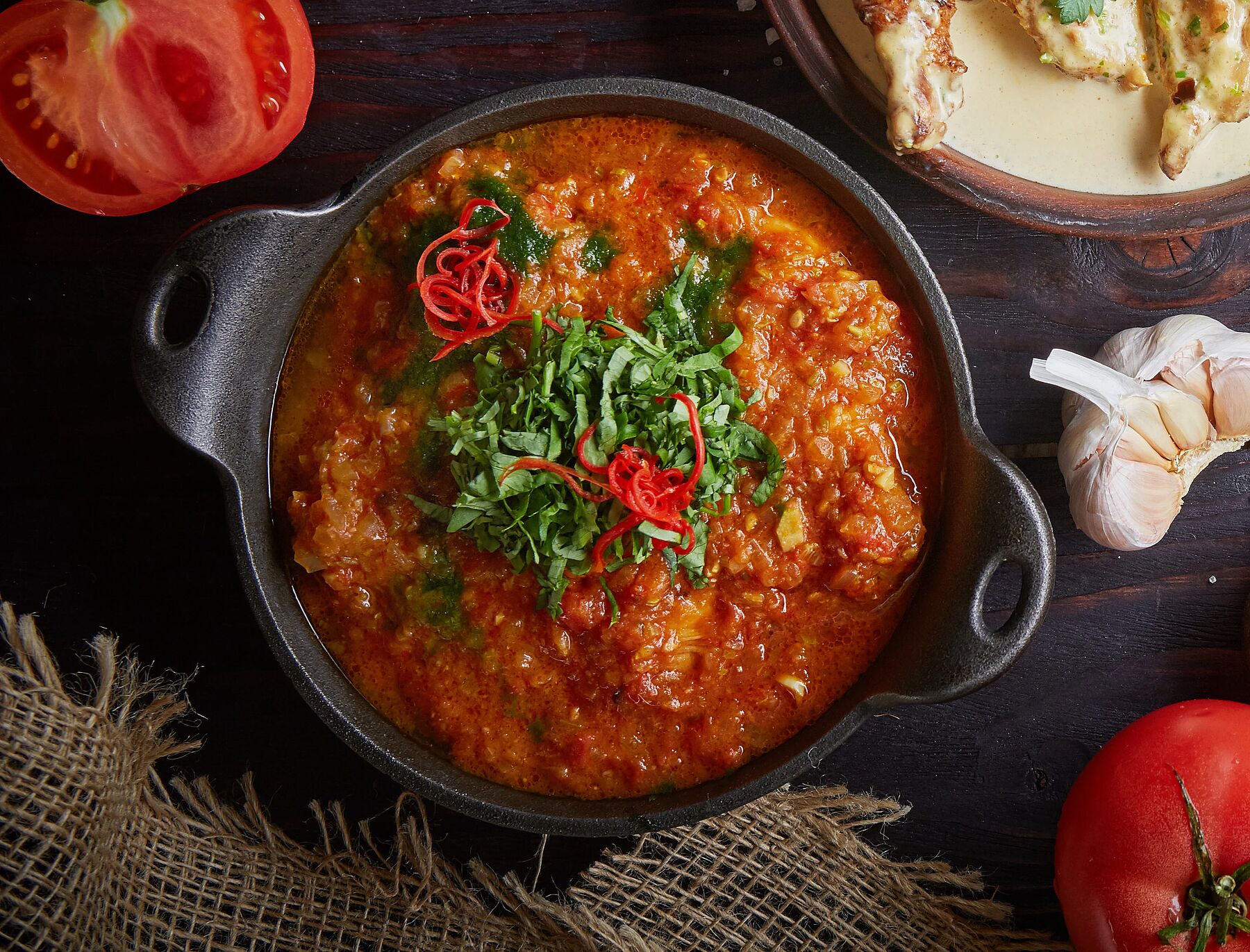 Нарежьте мясо на кусочки среднего размера, добавьте немного аджики. Лук нарежьте тонкими полукольцами, выложите к мясу и тщательно перемешайте. Добавьте немного соли, снова перемешайте и оставьте мариноваться на 30 минут. Разогрейте сковородку с небольшим количеством растительного масла и выложите мясо вместе с маринадом. Помидоры и чеснок тщательно измельчите и выложите на сковороду, аккуратно перемешайте, протушите 3–4 минуты. Затем добавьте бульон, аджику и черный перец по вкусу. Тушите 10 минут. Подавайте на подогретой в духовке глубокой тарелке, лучше глиняной. При подаче украсьте зеленью и перчиком чили.
