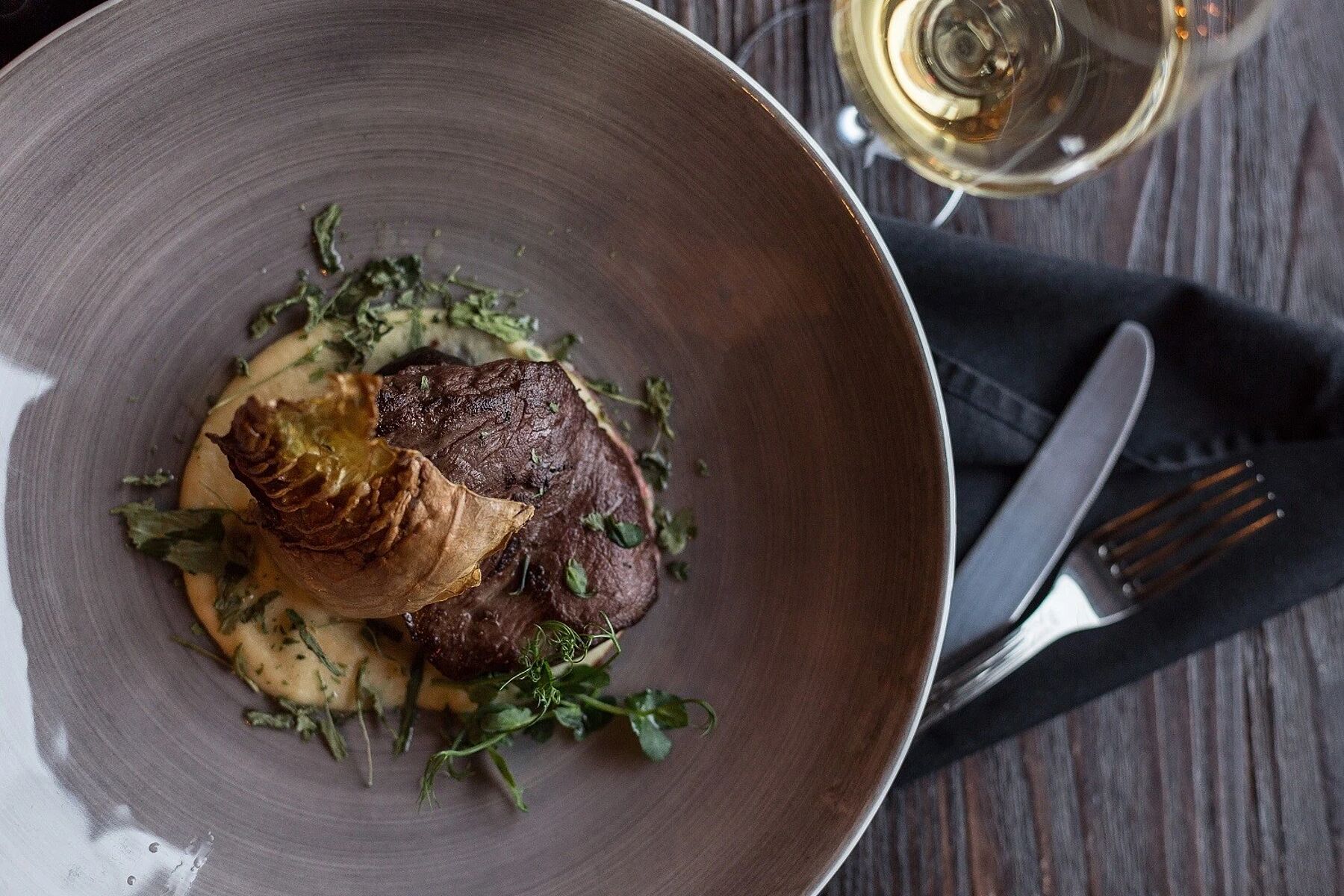 Оленину обжарьте на растительном масле до прожарки rare, добавьте на сковороду сливочное масло и доведите прожарку до степени medium rare. Затем обожгите оленину с помощью кулинарной горелки.