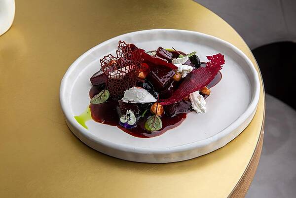 Овощи нарежьте средними кубиками. В кастрюле разогрейте оливковое масло и пассеруйте овощи. Выложите в кастрюлю телячьи щечки, влейте вино, затем бульон. Добавьте лавровый лист, душистый перец и паприку. Посолите и поперчите. Готовьте на медленном огне 3 часа. После этого выньте щечки. Бульон с овощами упарьте наполовину на сильном огне, затем измельчите блендером и протрите через сито. Добавьте нарезанный зеленый лук. Получится соус. Карамелизуйте щечки в соусе. Для этого сначала нужно в течение 10 минут подсушить их в духовке при температуре 180 °C. Затем достаньте щечки, полейте соусом и снова поставьте в духовку при той же температуре на 4 минуты. Повторите эти действия еще трижды. В подсоленной воде отварите картофелину в мундире, очистите. На сковороде разогрейте оливковое масло, поджарьте грибы и мелко нарезанный зубчик чеснока. Когда грибы будут готовы, отложите примерно пятую часть. Слегка подогреть сливки. Измельчите в блендере основную массу поджаренных грибов с картофелем и сливками, затем протрите сквозь среднее сито для получения нежного и однородного пюре. Неочищенную целую свеклу заверните в фольгу и запекайте в духовке 2 часа при температуре 180 °C. Затем достаньте, остудите, очистите и нарежьте небольшими кубиками. Сбрызните белым бальзамическим уксусом, посолите и поперчите. На тарелку выложите грибное пюре, сверху — половину телячьей щечки, а на нее — свеклу и немного поджаренных грибов (из тех, что вы отложили). Украсьте листьями молодой свеклы или порошком из сушеной свеклы.