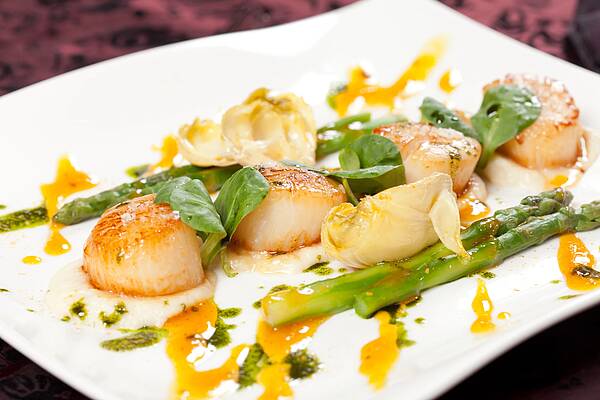 Разогрейте сковороду, смажьте тонким слоем оливкового масла и на довольно сильном огне обжарьте гребешки с двух сторон до золотистого цвета. Затем закройте сковороду крышкой и оставьте приблизительно на 2 минуты, чтобы гребешки приготовились. Посолите и поперчите. Спаржу промойте в холодной воде. Разломите побеги на две части. Верхнюю часть побегов бланшируйте в подсоленной кипящей воде. Нижнюю часть нарежьте на мелкие кусочки, похожие по размеру на рисовые зерна. Разогрейте в кастрюле столовую ложку оливкового масла, поджарьте чеснок и мелко нарезанный лук. Добавьте белое вино, кусочки спаржи и сливки. Готовьте, помешивая, пару минут. Затем снимите с огня и посыпьте половиной подготовленного тертого пармезана (50 г). Он придаст блюду текстуру ризотто. Посолите и поперчите. Четыре ягоды физалиса разрежьте пополам и отложите. Другие четыре ягоды измельчите в ручном блендере с подсолнечным маслом — получится соус. Оставшиеся 50 г тертого пармезана выложите на пергамент и поставьте в микроволновую печь на 20 секунд, затем достаньте и остудите — у вас получится очень тонкий сырный чипс. При подаче на дно тарелки положите «ризотто», на него выложите гребешок и верхушки спаржи. Обрамите соусом из физалиса и половинками физалиса. Украсьте кусочками сырного чипса.