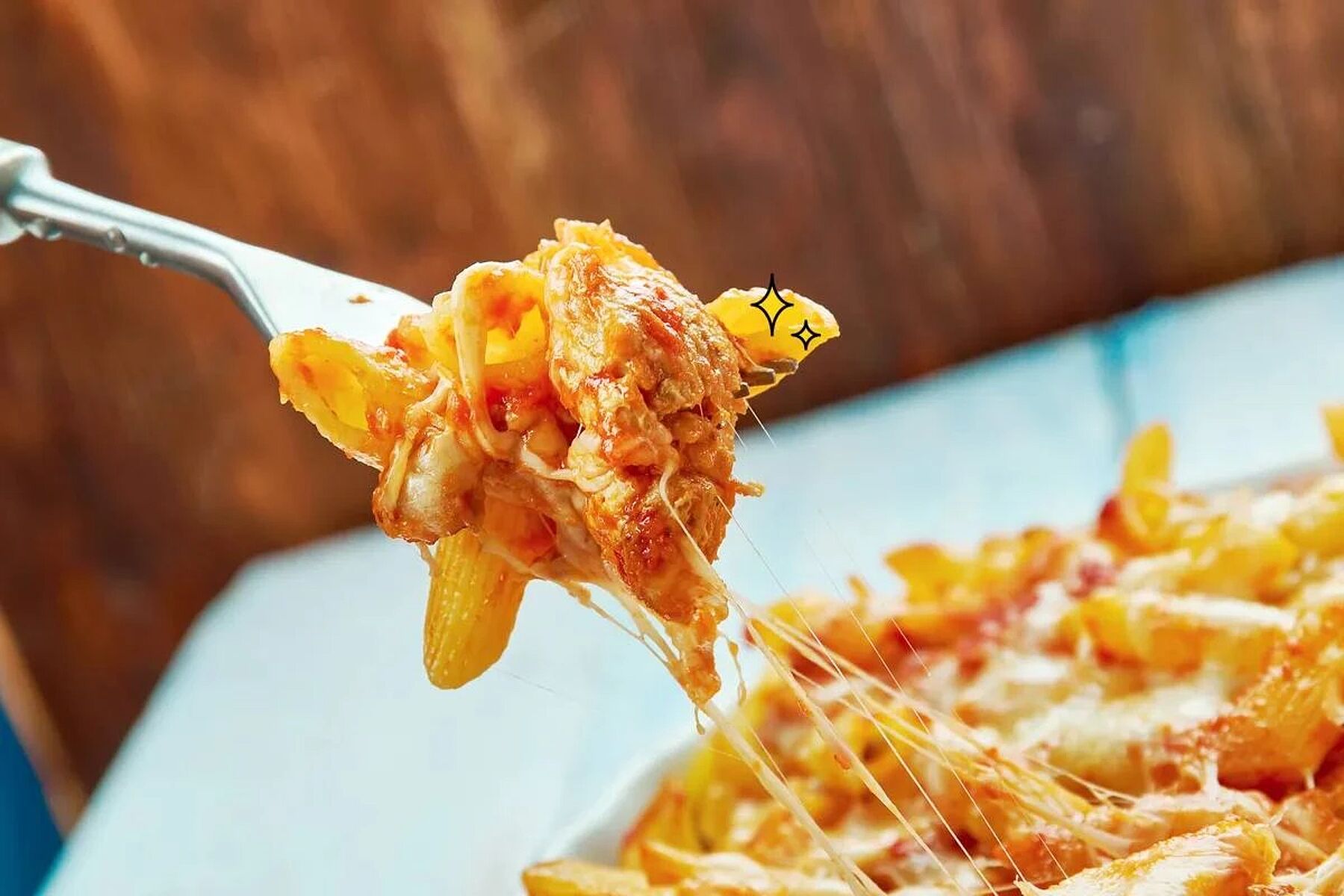 Сварите пасту о состояния аль денте. Мелко нарежьте лук. Обжарьте его в большой сковороде на среднем огне вместе с говяжьим фаршем до тех пор, пока фарш не перестанет быть красным. Постоянно помешивайте, не допуская образования комочков. Влейте томатный соус и готовьте ещё 15 минут. Разогрейте духовку до 175 градусов. Натрите проволоне и пармезан, крупно нарежьте моцареллу. Форму для запекания смажьте сливочным маслом и выложите запеканку слоями: сначала половину пасты, проволоне, сметану и половину фарша с томатным соусом, затем моцареллу, вторую половину фарша и пасты. Посыпьте пармезаном. Запекайте в духовке 30 минут.