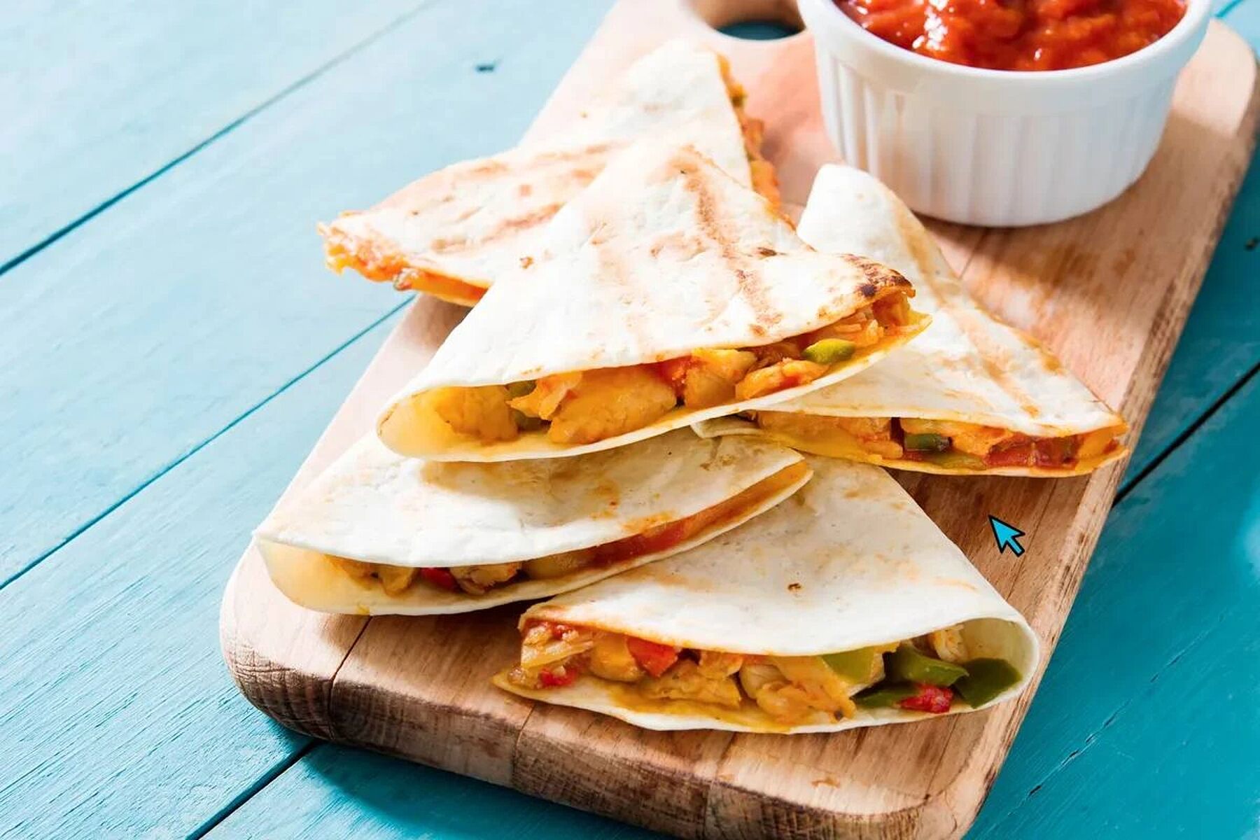 Разогрейте духовку до 175 градусов. Форму для выпечки или противень выстелите фольгой. Нарежьте куриные грудки кубиками или небольшими кусочками. В миске соедините курицу с приправой фахита, тщательно перемешайте руками и переложите на фольгу. Запекайте около 5 минут. Мелко нарежьте лук, перцы — полукольцами. В большой сковороде обжаривайте на растительном масле перец, лук и курицу, пока овощи не станут мягкими. Натрите сыр. Выложите готовую начинку вместе с беконом и сыром на тортильи, сложите каждую пополам и переложите на противень. Запекайте кесадильи в духовке около 10 минут, чтобы сыр хорошо растаял.