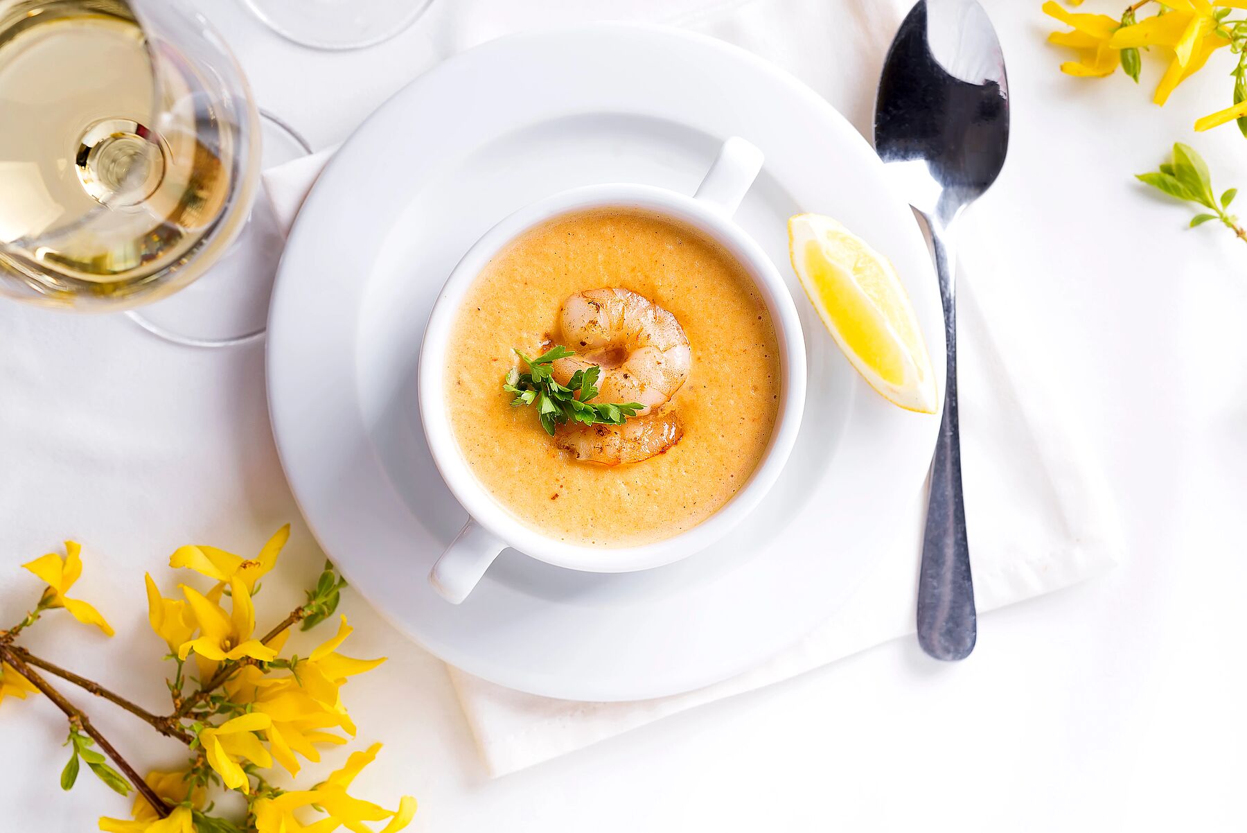 Очистите кукурузу в початках, разделите каждый на три части и срежьте зерна. Их должно быть около 400 грамм. Нарежьте соломкой лук и морковь. Обжарьте их до полуготовности на растительном масле и добавьте карри-пасту. Держите на огне до золотистого цвета. Добавьте к овощам кукурузные зерна, обжарьте. Влейте питьевую воду и варите 5—7 минут на слабом огне. Затем добавьте кокосовое молоко и доведите до кипения. Посолите по вкусу. Снимите с огня и пробейте всю массу в блендере. Обжарьте креветки на растительном масле до полуготовности и добавьте их в суп. Сверху положите попкорн из кукурузы. Натрите на мелкой терке пармезан и посыпьте им суп перед подачей.