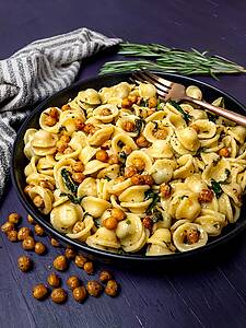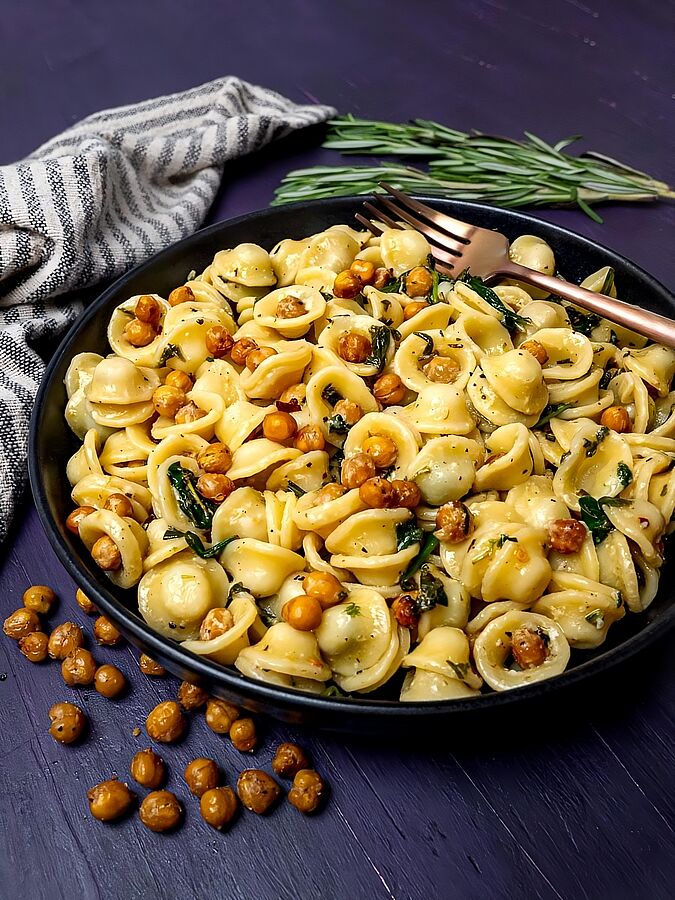Замочите сушеный нут на ночь (его, к слову, можно заменить фасолью). На следующий день отварите в течение 1–2 часов до готовности. Половину выньте и отложите. В кастрюлю к оставшейся половине добавьте пасту — лучше взять небольшую короткую, пенне или макарони. Добавьте веточку розмарина и варите до готовности пасты. Тем временем перетрите отложенную половину нута в блендере и когда паста будет готова, выложите в кастрюлю. Доведите до кипения и подавайте как суп, вместе с жидкостью, в которой варились нут и паста. В каждую тарелку добавьте пару капель оливкового масла.