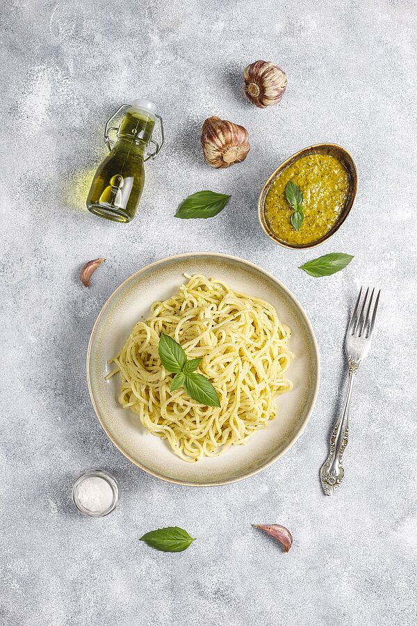 Сначала приготовьте соус. Для этого мелко нарежьте немного лука, а грудинку или любое другое копченое мясо — кубиками. Разогрейте на сковороде оливковое масло и тушите лук вместе с грудинкой и зеленым горошком (лучше использовать свежий, а не сушеный или консервированный). Тем временем сварите пасту (в идеале — фарфалле). За несколько минут до готовности соуса влейте небольшую порцию сливок. Подождите, пока жидкость немного не выпарится, и выключайте огонь. Готовую пасту переложите на сковороду, хорошо перемешайте. Подавайте с тертым сыром.