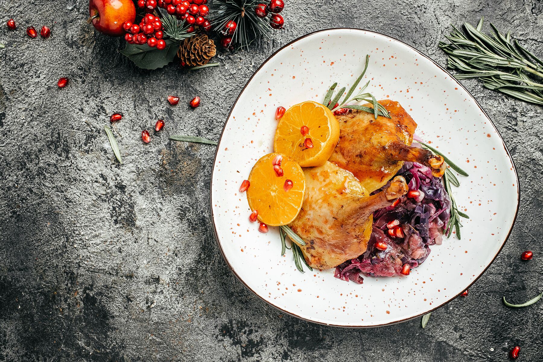 Кусочки утки выложите на блюдо, полейте соусом. Украсьте отложенными ягодами и веточками красной смородины. Гарнир к этому блюду должен быть очень легким — например картофельное суфле или немного отварного риса с изюмом.