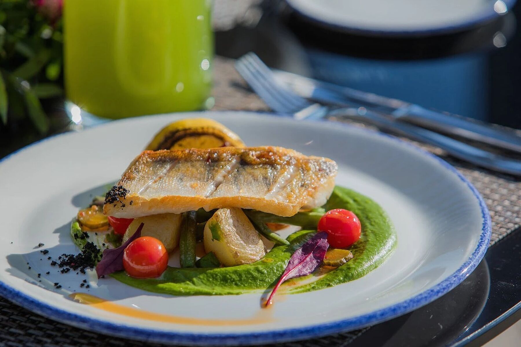 Обжарьте филе сибаса на пергаменте (чтобы кожа не прилипла и был красивый цвет) со стороны кожи до румяной корочки, переверните и обжарьте до готовности. Для подачи на тарелку выложите крем из пастернака, сверху — обжаренное рыбное филе и слегка обжаренный свежий шпинат. Украсьте соусом жу.