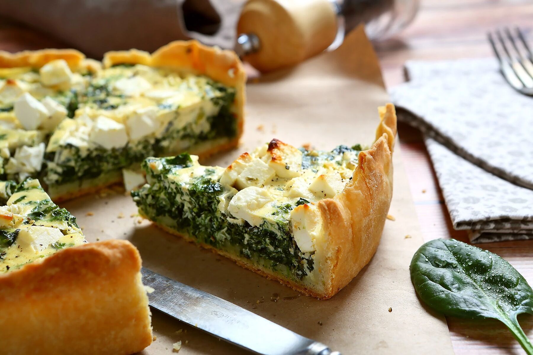 На основу киша выложите шпинатно-луковую смесь и разрезанные на две части помидоры, разровняйте. Осторожно залейте яично-сырной смесью и выпекайте около 25–30 минут при 200°C до румяной корочки. Дайте немного остыть и подавайте на стол.
