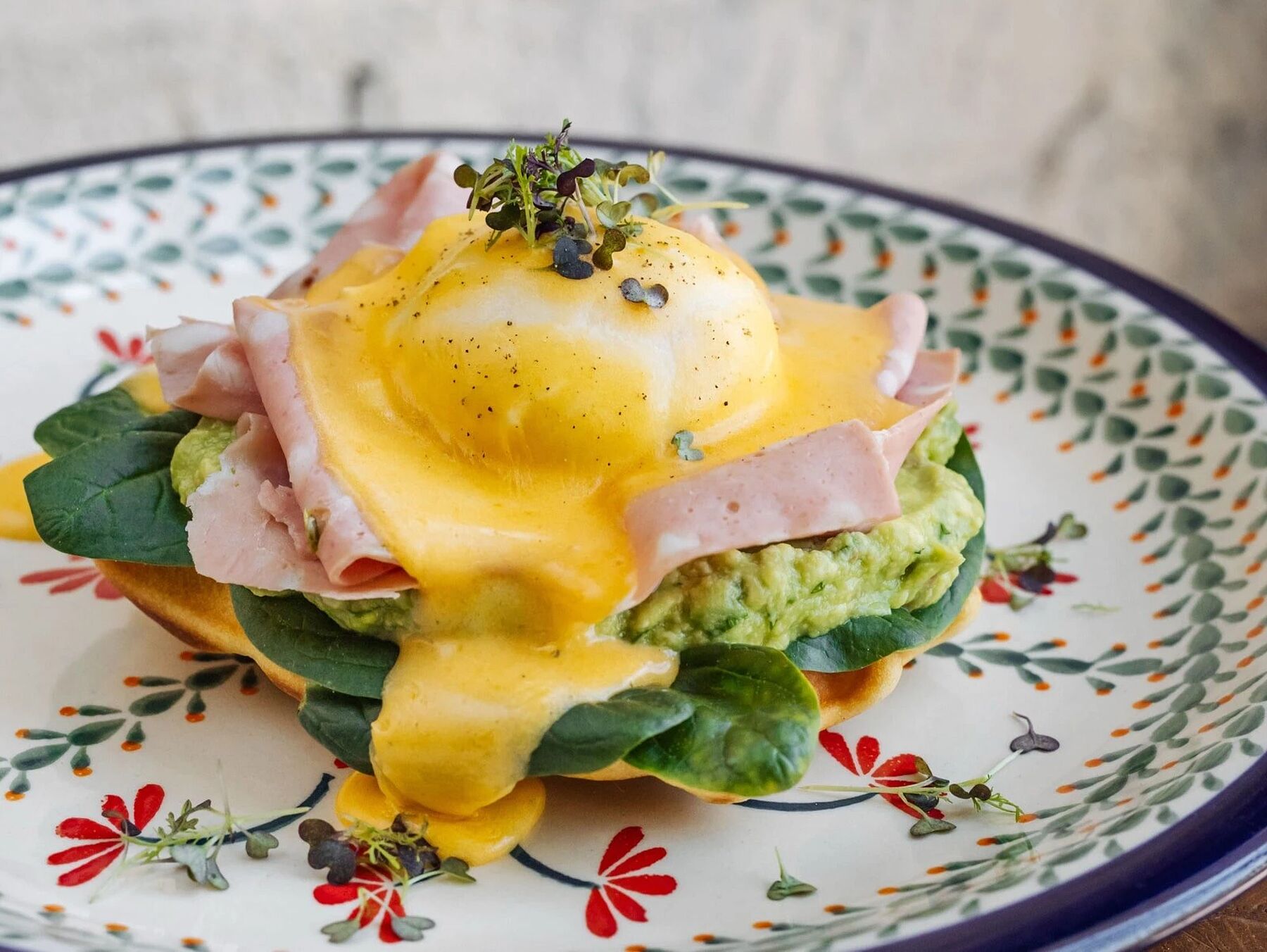 Сварите яйцо пашот. Выложите готовую вафлю на тарелку, сверху выложите 10 г мини-шпината, 50 г гуакамоле, 50 г тонко нарезанной мортаделлы. На мортаделлу выложите яйцо пашот и полейте соусом.