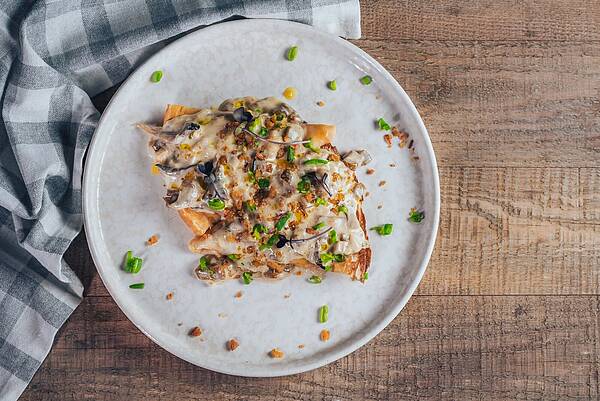 Вылейте молоко в большую миску, добавьте яйцо, соль, сахар, перемешайте. Добавьте просеянную муку. Вымешайте тесто до однородности, затем добавьте растительное масло. Приступайте к приготовлению блинов. Затем нарежьте грибы и лук мелким кубиком, обжарьте на растительном масле до золотистого цвета. Добавьте сливки, соль, выпарите соус до консистенции йогурта и добавьте трюфельное масло. Блины сверните конвертом (2 шт. на порцию), сверху выложите готовую начинку, посыпьте луком фри, рубленым зеленым луком и полейте трюфельным маслом.
