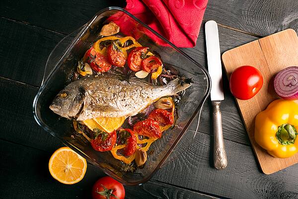 Выложите на перцы рыбу надрезанной стороной вверх. Верните противень в центр духовки. Запекайте до готовности рыбы — 12–14 минут, если рыба мелкая, и 16–20 минут, если крупная. Подавайте сразу же.